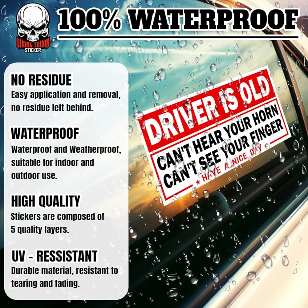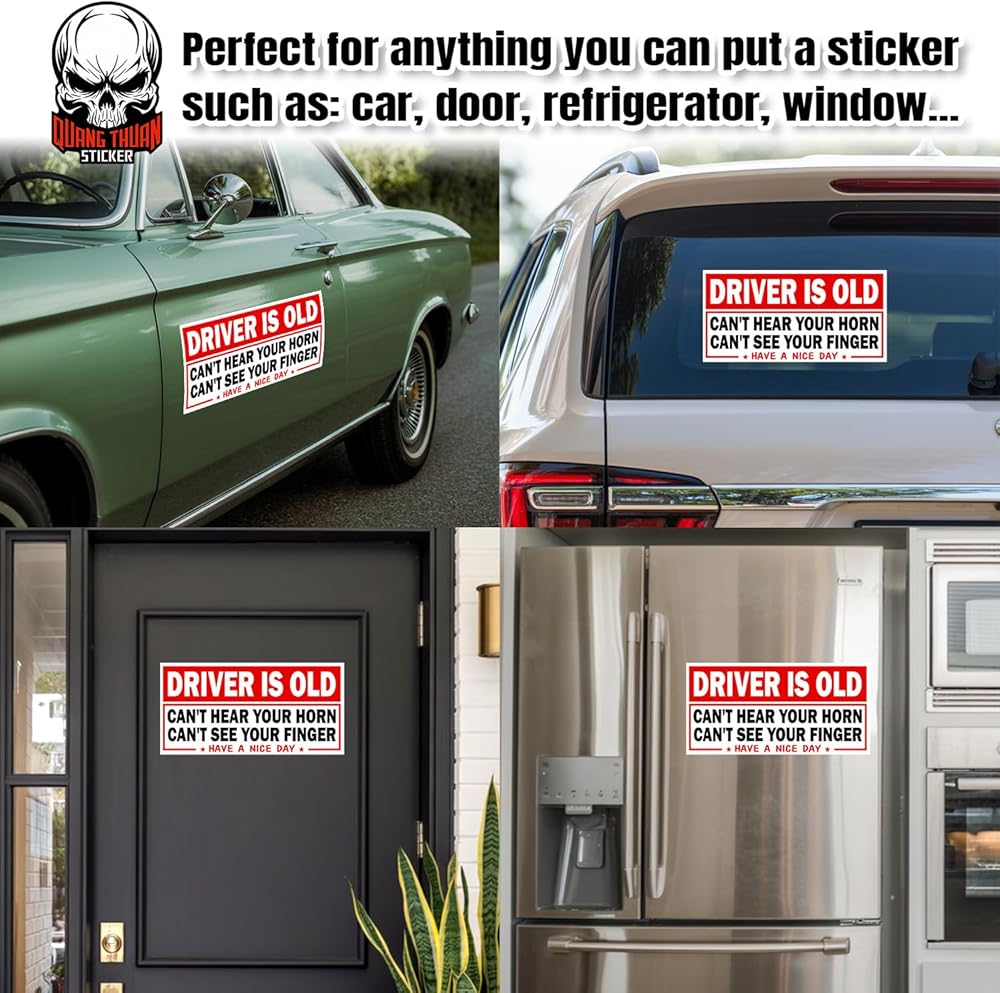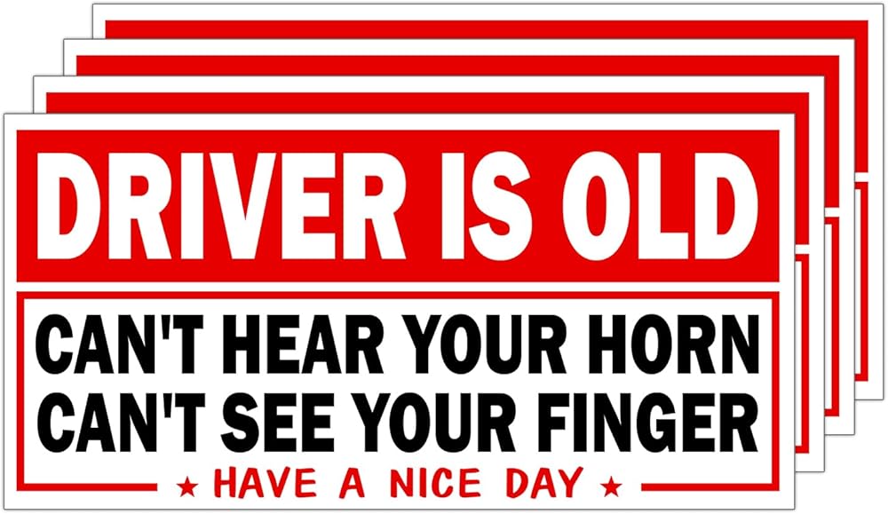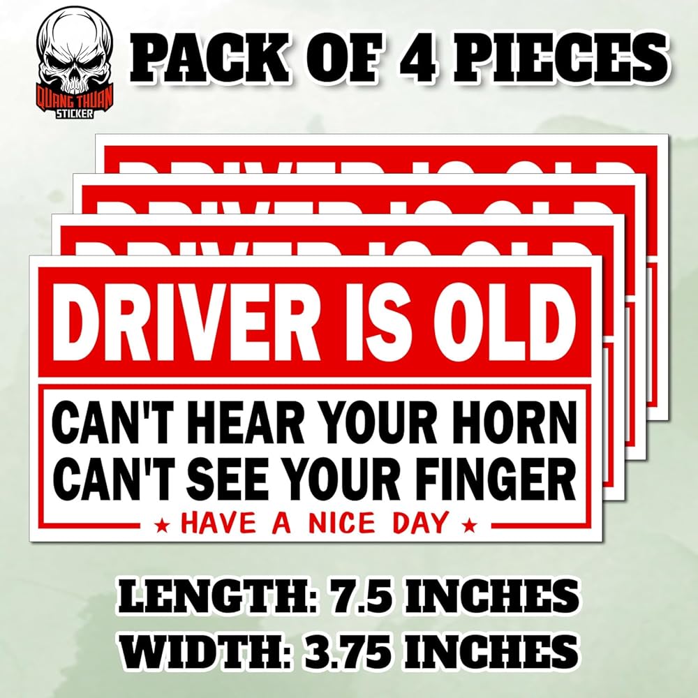 (4Pcs-7.5x3.75in) Driver is Old Can't Hear Your Horn Can't See Your Finger Bumper Stickers Funny Warning Senior Driver Waterproof Vinyl Stickers for Vehicles Cars