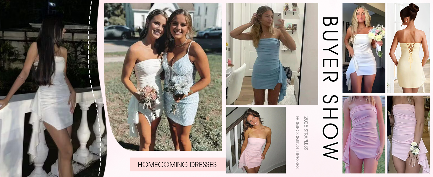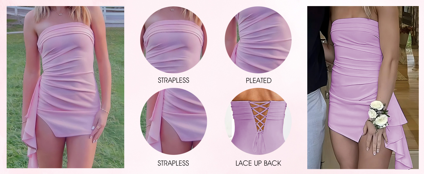 Dress Features: Satin short homecoming dresses with slit ruffles, strapless, tight bodycon, pleated/ruched, open back/backless, sleeveless, zipper back, above knee length, fully lined, built-in bra, mini graduation cocktail party dress