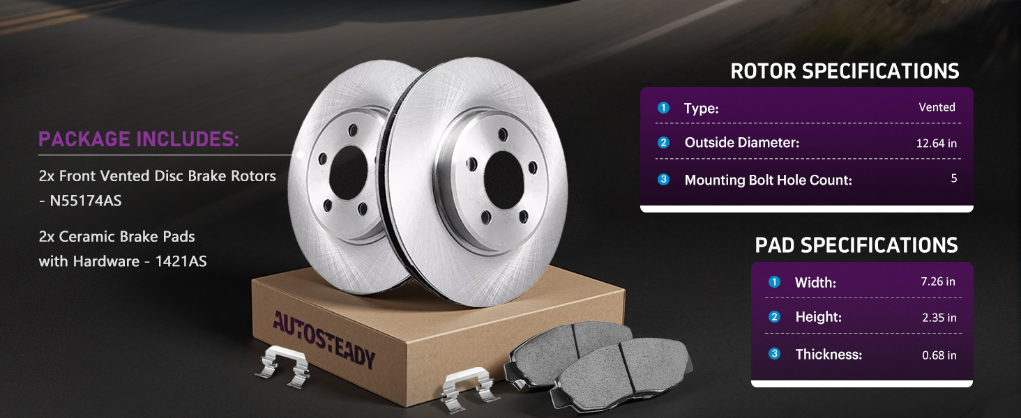 Brake Rotor Specifications: Position: Front Driver Side and Passenger Side. Rotor Type: Vented. Outside Dia: 12.64 in. Hub Holes Centering Dia: 2.65 in. Mounting Bolt Hole Quantity: 5. Bolt Circle Dia: 4.72 in. Bolt Dia: 0.64 in