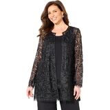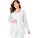 Crafted with intricate allover lace, this jacket is the epitome of feminine grace. It's unlined for a lightweight, airy feel and has an open front with a hook-and-eye closure at the jewel neckline. It's also styled with 3/4 length sleeves and a scalloped hemline. FABRIC: Durable, yet soft, lightweight, and comfy. FIT: Easy fit with a flattering silhouette. Allover lace, unlined, jewel neckline with hook and eye closure, open front, 3/4 length sleeves, and scallop hem. 100% Polyamide. Machine wash. Imported Plus Size Jacket. 33” length. Plus Sizes 0X-6X.