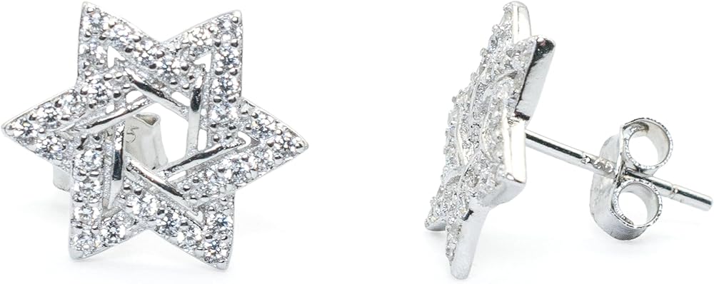 Add a touch of elegance to your jewelry collection with these stunning Star of David stud earrings. Crafted from premium 925 sterling silver, each earring features a beautifully designed 12mm Star of David adorned with sparkling cubic zirconia crystals. The classic six-pointed star design showcases intricate detailing and catches light from every angle, creating a mesmerizing display of brilliance. These versatile studs are perfect for both everyday wear and special occasions, making them an ideal choice for celebrating Hanukkah or expressing your faith with sophistication. The secure stud backing ensures comfortable, worry-free wear, while the high-quality sterling silver construction provides lasting durability. These timeless earrings arrive beautifully packaged, ready to be treasured or given as a meaningful gift that celebrates Jewish heritage and tradition.