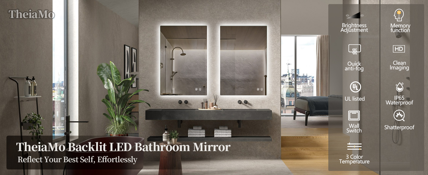 【HD Mirror】 5mm HD explosion-proof glass, mirror imaging reflection accuracy up to 99.99%. TheiaMo wall mirror is made of unique insulating waterproof protective paint and anti-oxidation protective layer, which good at waterproof and prevent led bathroom mirror from oxidation and rust. But also keep electricity running safely when in use. Thus, it can be more durable and less maintenance.
