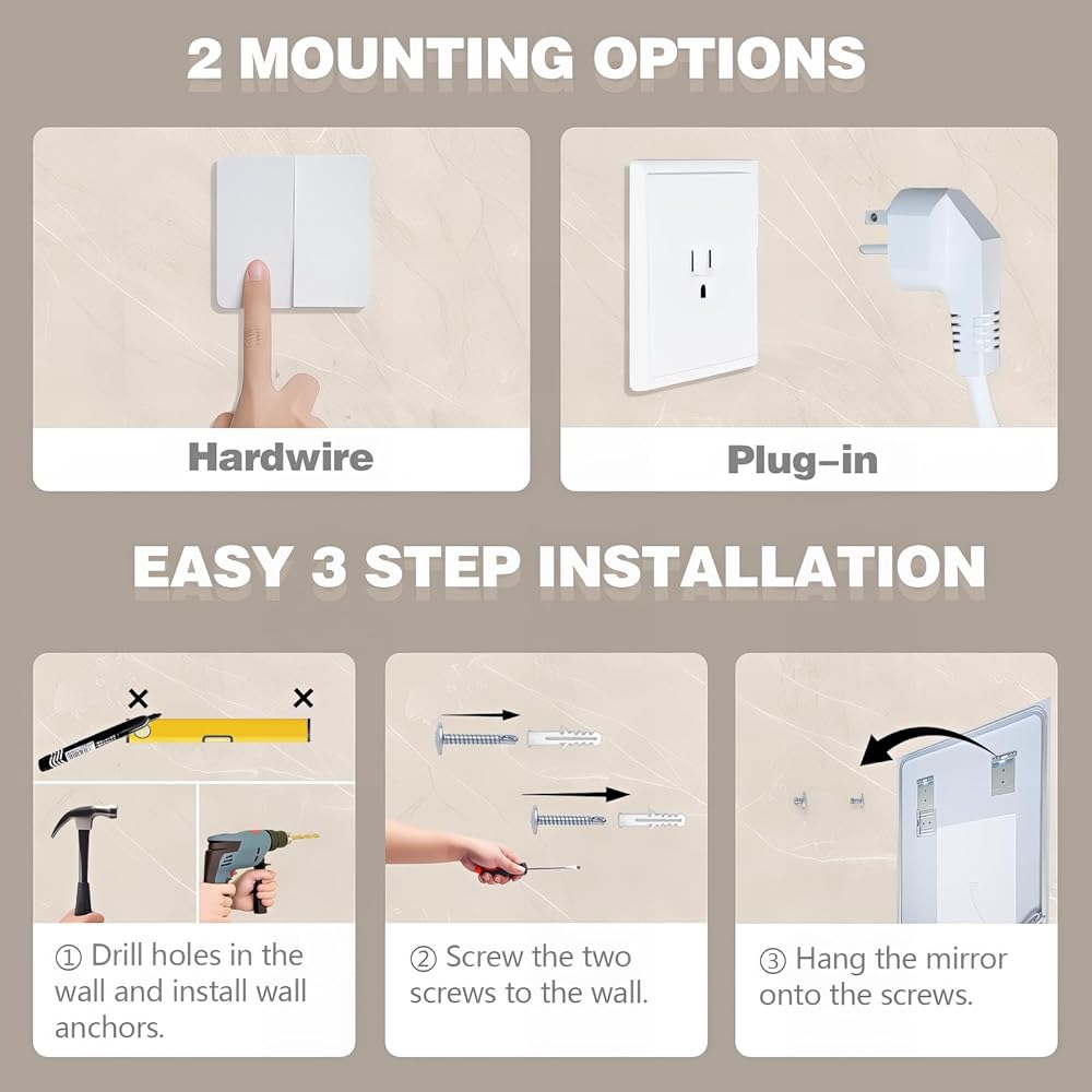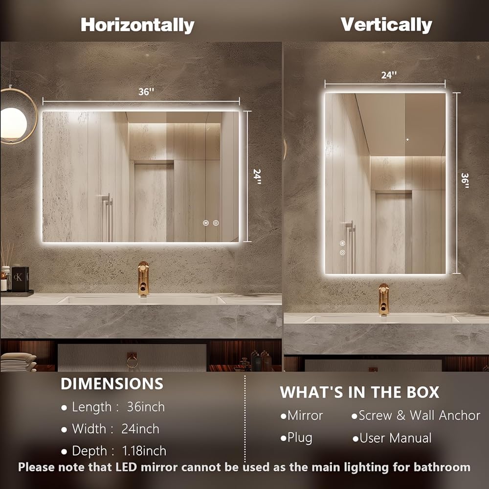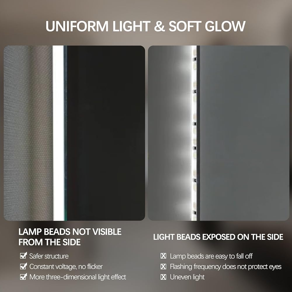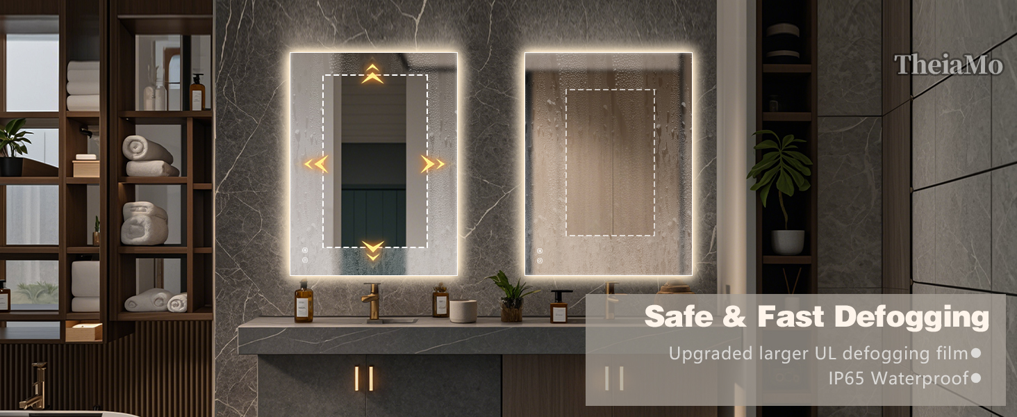 【Newly Upgraded Anti-Fog Bathroom Mirror】 Increased to 50% anti-fog area, faster and cleaner fog removal, easy to erase in 15 minutes. Independent control, anti-fog can be opened and closed according to need, safety and energy saving.