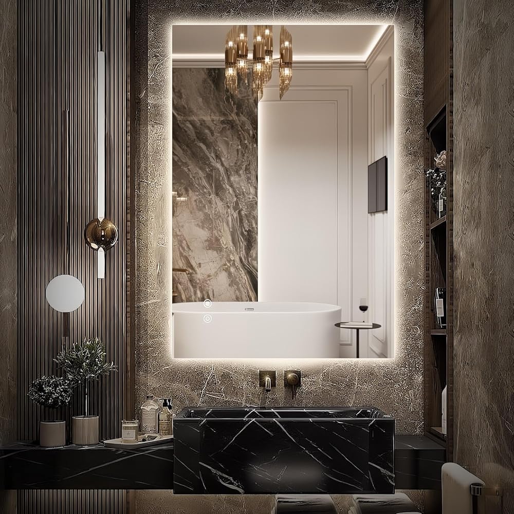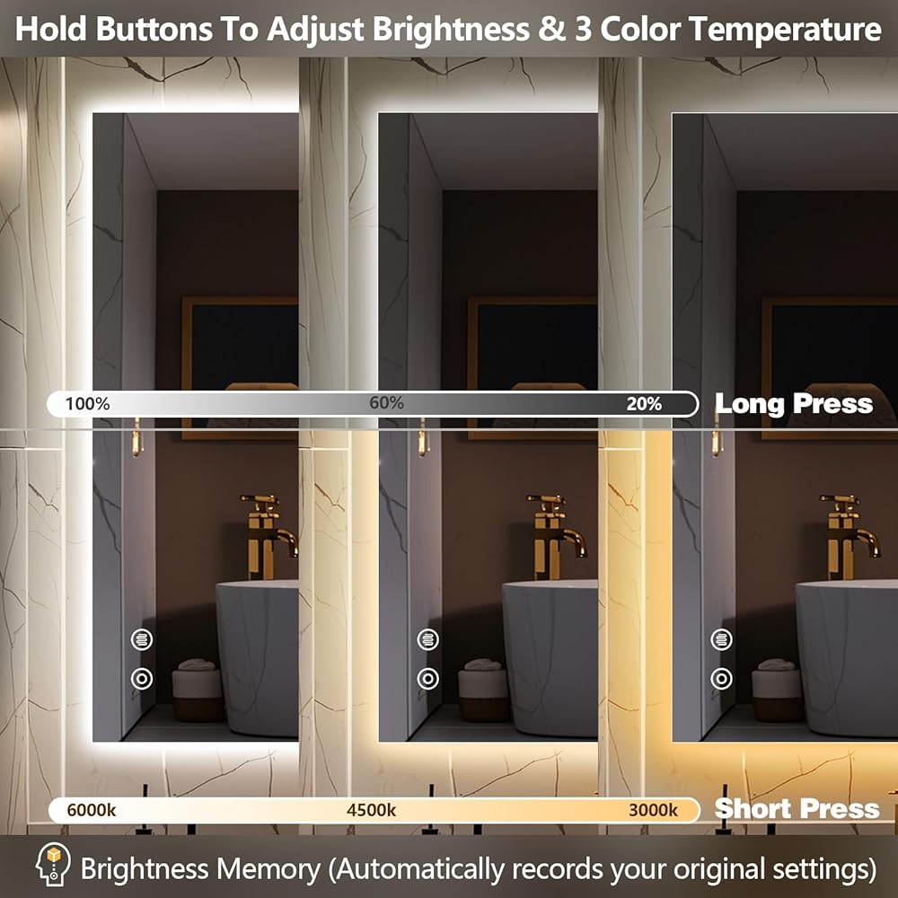 【3 Color Temperature Memory Function Smart Mirror】 can be dimmed to meet daily needs and record your preferences. Warm light (3000K) is ideal for creating a warm atmosphere. Natural light (4500K) simulates daylight conditions for daily skin care, while white light (6000K) provides brighter light for additional needs. It is worth noting that the mirrors provide good ambient lighting, and they are also primarily designed for this purpose, not to replace separate lighting fixtures.
