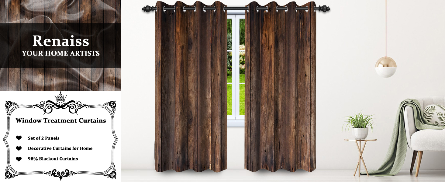 Renaiss 42 x 84 Inch Rustic Wood Blackout Curtains for Bedroom Vintage Brown Wooden Planks American Country Decorative Curtains Drapes Rod Pocket Farmhouse Retro Window Treatments Decor 2 Panels