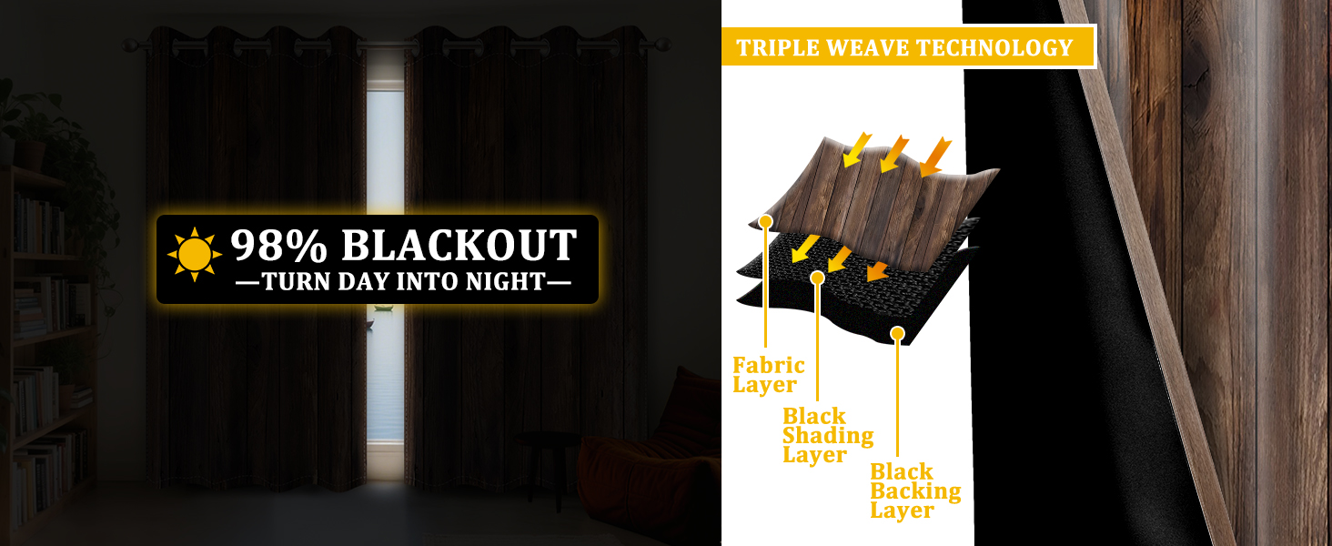 ♥GUARD YOUR SLEEP: Rustic blackout curtains are designed three layers of fabric, professional blackout lining with high quality polyester fiber,The middle is black silk fabric,the backside is black fabric,which makes it a better shading effect.The fabric is high-end and has a good texture.Perfect for bedroom, home theaters, or any room where you want to create a completely dark environment, effectively blocking sunlight from entering the room and providing you with a better sleeping environment.