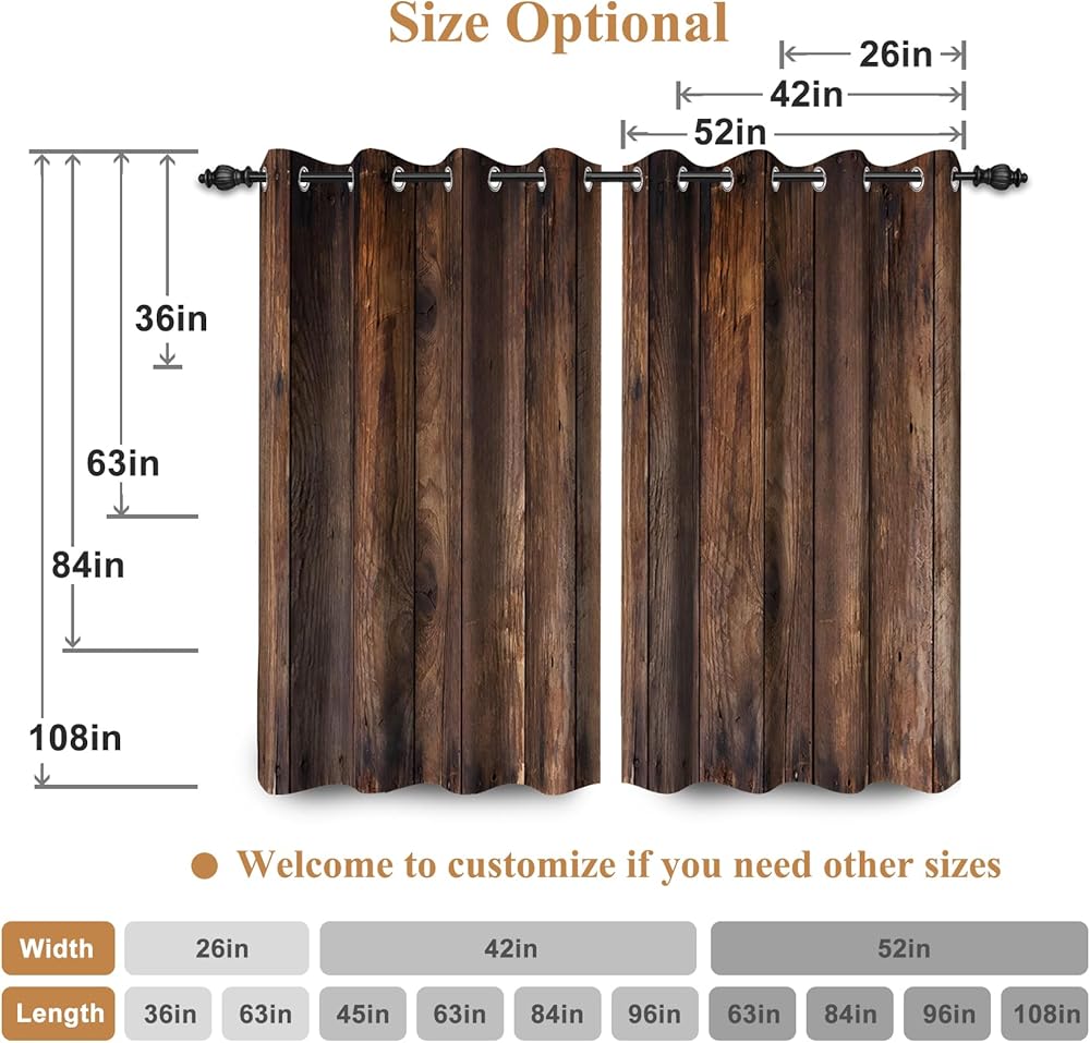 ♥PACKAGE INCLUDES:2 panels of rustic wood curtain(42 inch wide by 84 inch long each). Each panel has 6 grommet.The interior diameter of the hole is 1.6 inch.suitable for most standard curtain rods and make it easy to install or use.