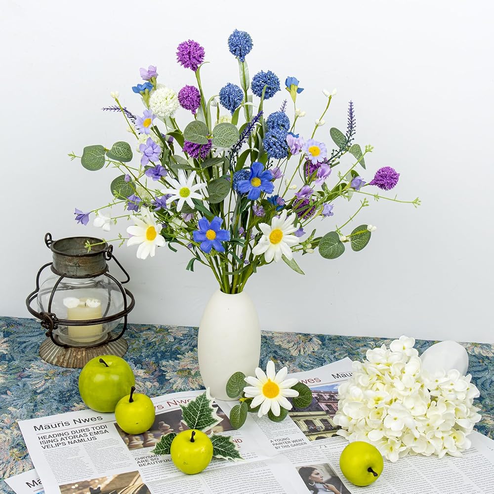 Vibrant Spring Floral Picks: This set of 12 handcrafted Spring flower stems features a cheerful mix of white, purple, and blue daisies and dandelion blooms, accented with lively greenery for an authentic touch of spring.