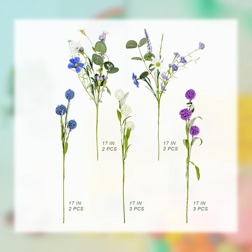 J'FLORU Artificial Spring Flowers 12 Pack Spring Floral Picks 17 Inch Flower Stems with Blue White Purple Dandelions for Spring Summer Easter Flower Arrangements Centerpieces