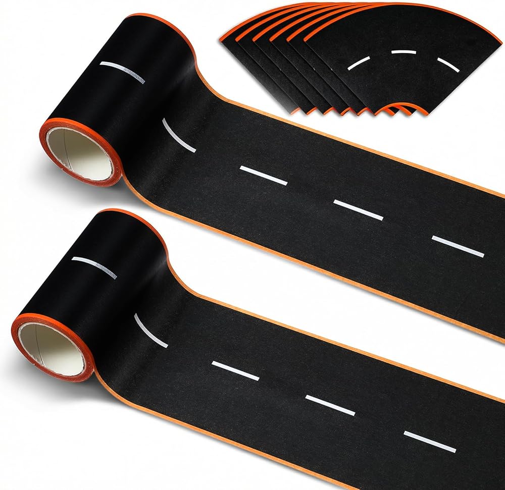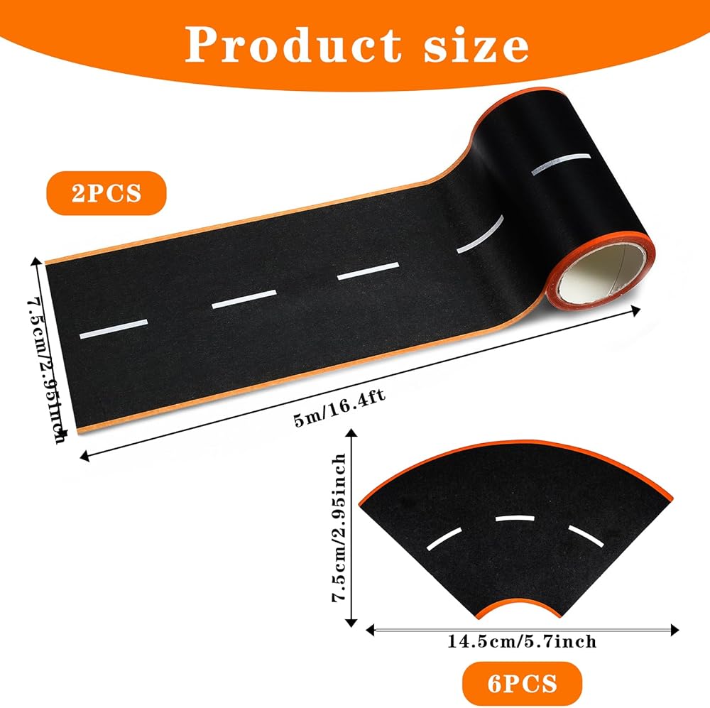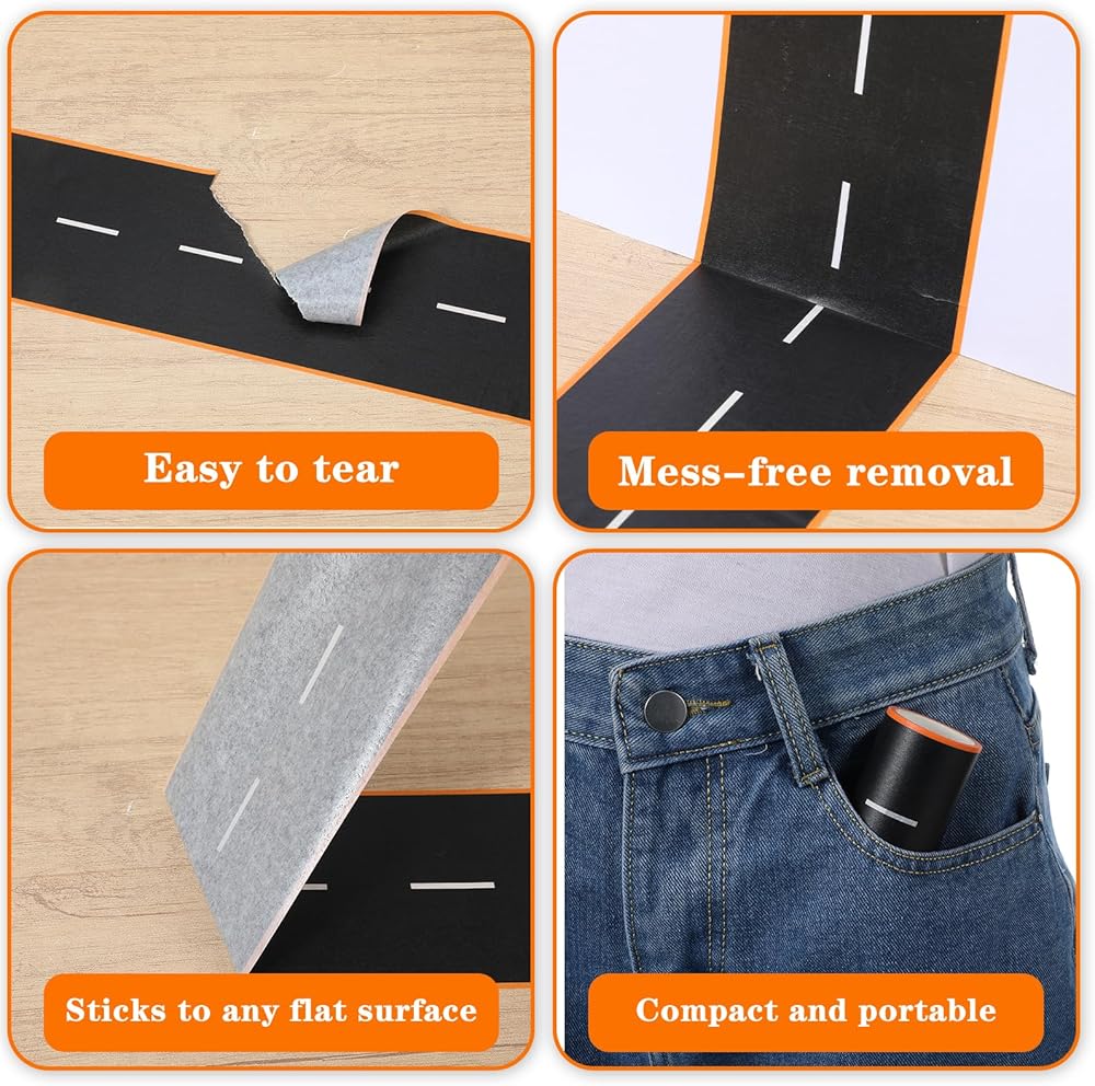 Our road tape is perfect for creating straightaways, curves, intersections, and complex race tracks. Simply unroll the tape and stick it onto any flat surface, such as floors, tables, or walls. The tape can be easily torn by hand, making it convenient for kids to adjust and modify their track designs.