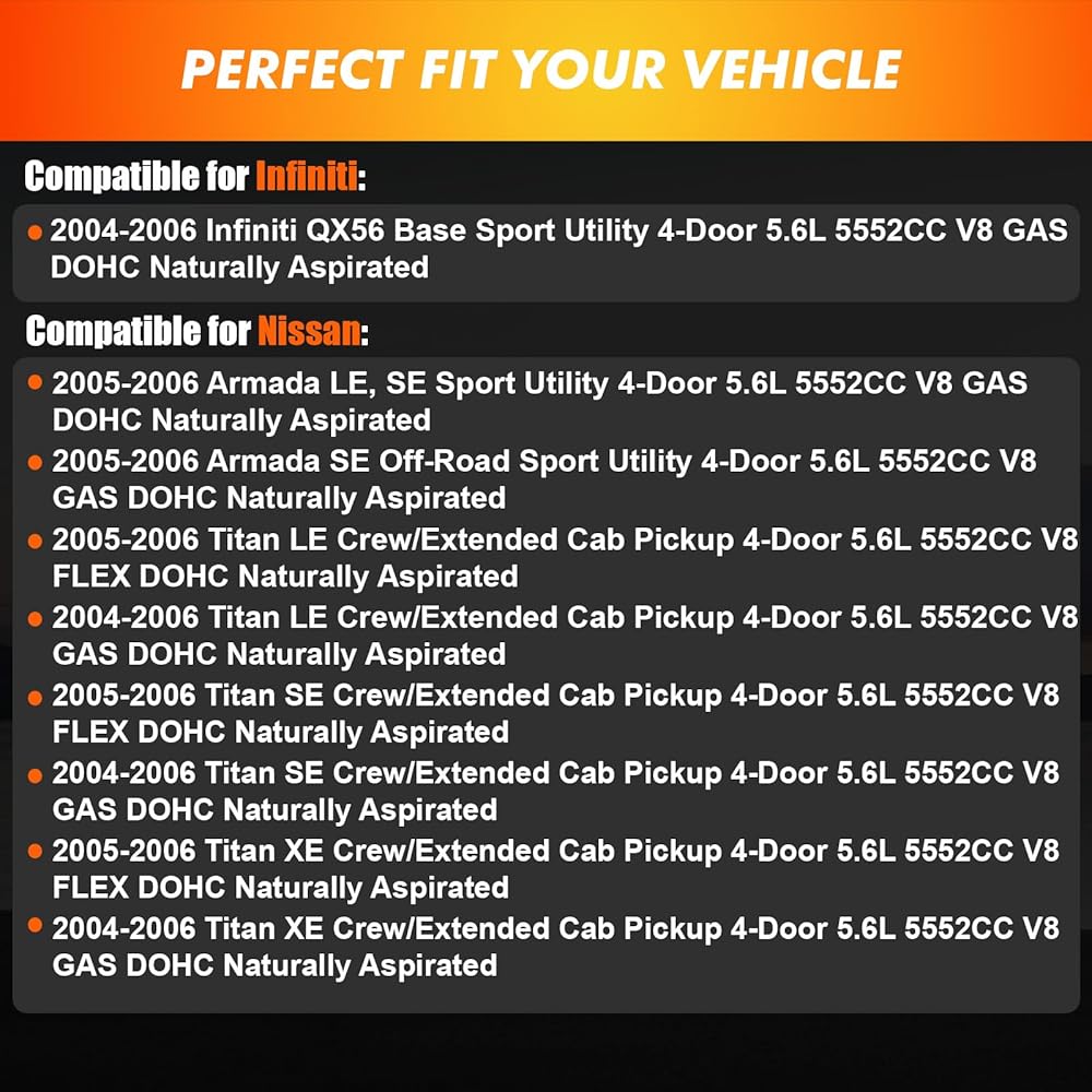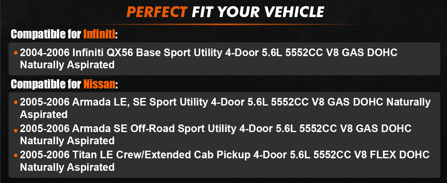 Compatible models 2: This oxygen sensor upstream and downstream kit is compatible for Infiniti 2004-2006 QX56 Base Sport Utility 4-Door 5.6L V8. Please confirm compatibility with your vehicle before purchase.