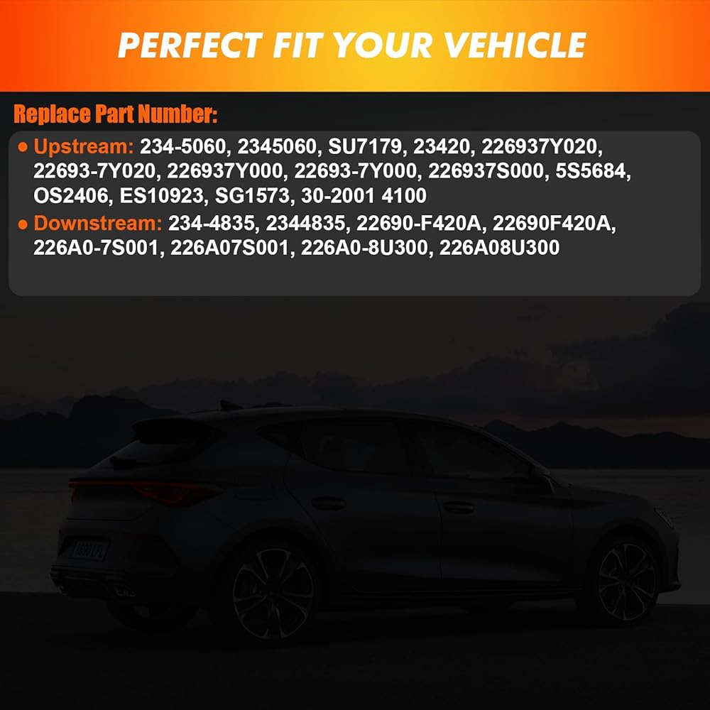 OE Part Numbers: Upstream: 234-5060, 2345060, SU7179, 22693-7Y020, 226937Y020, 22693-7Y000, 226937Y000, 226937S000, 22693-7S000, 5S5684, OS2406, 23420, ES10923, SG1573, aem 30-2001, 30-4100; Downstream: 234-4835,2344835,22690-F420A,22690F420A,226A0-7S001,226A07S001,226A0-8U300,226A08U300. Please check your old part number to ensure proper compatibility.