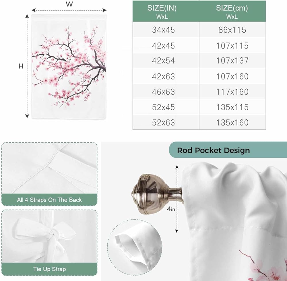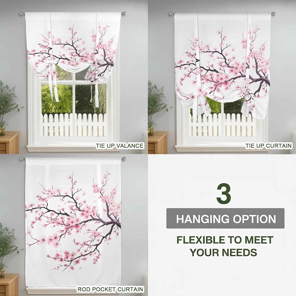 Pink Cherry Blossom Tie Up Curtains for Window, Spring Branches Floral Watercolor Thermal Insulated Balloon Shade Adjustable Rod Pocket Curtains Valance Panels for Kitchen Bathroom Café 42'' x 63''