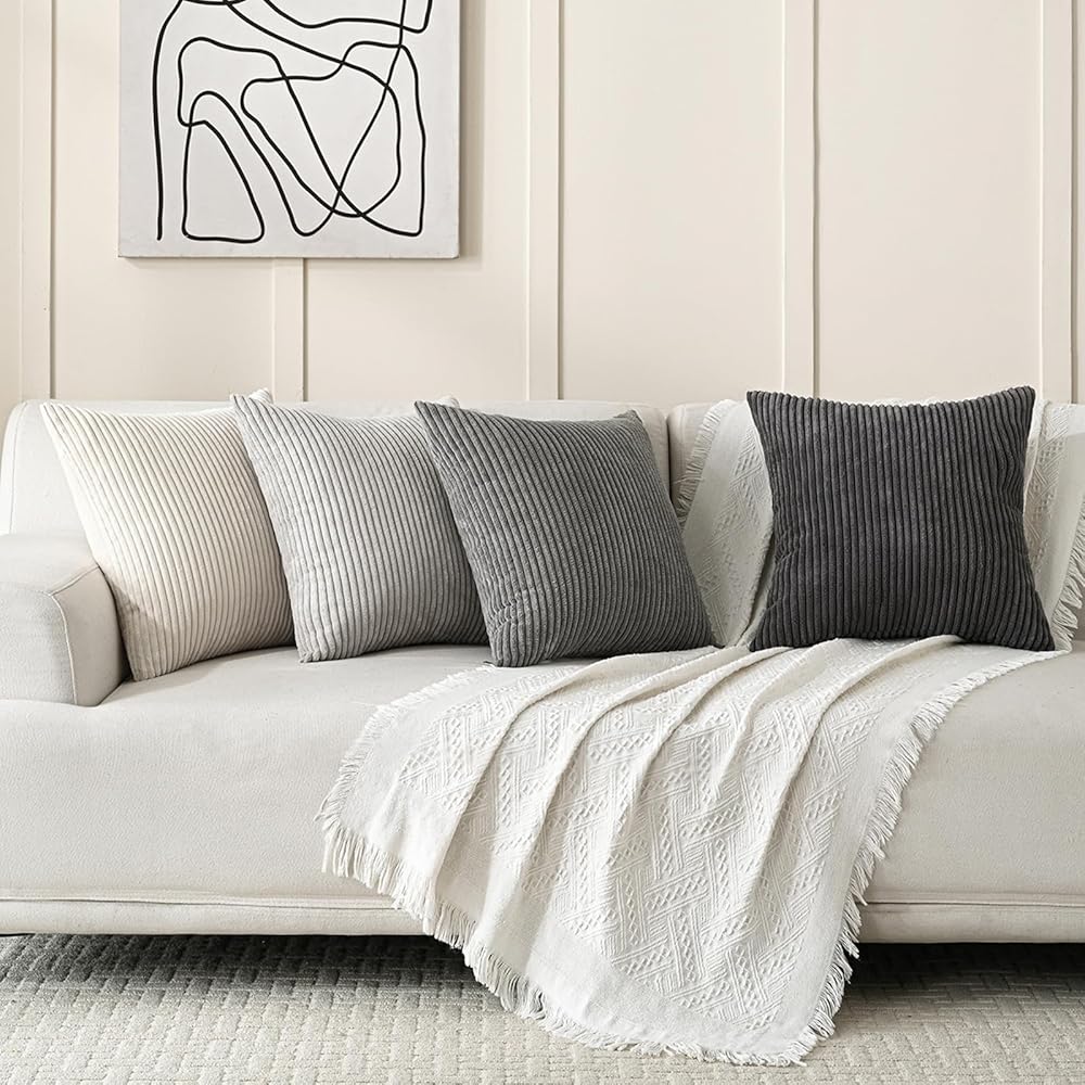 Volcanics Set of 4 Neutral Grey Corduroy Decorative Couch Throw Pillow Covers 18x18 Inch, Western Modern Farmhouse Striped Cushion Cases, Soft Boho Square Accent Pillow Covers for Home Sofa