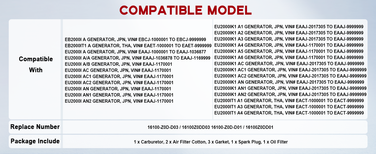 - 【Fitment】For HONDA EU2000I (A A/A A/B AC AC1 AC2 AN AN1 AN2) ,EU2000IK1 (A1 A2 A3 A4 A5 A6 AC AC1 AC2 AN AN1 AN2),EU2000IT1 (A1 A3 A4) inverter generator