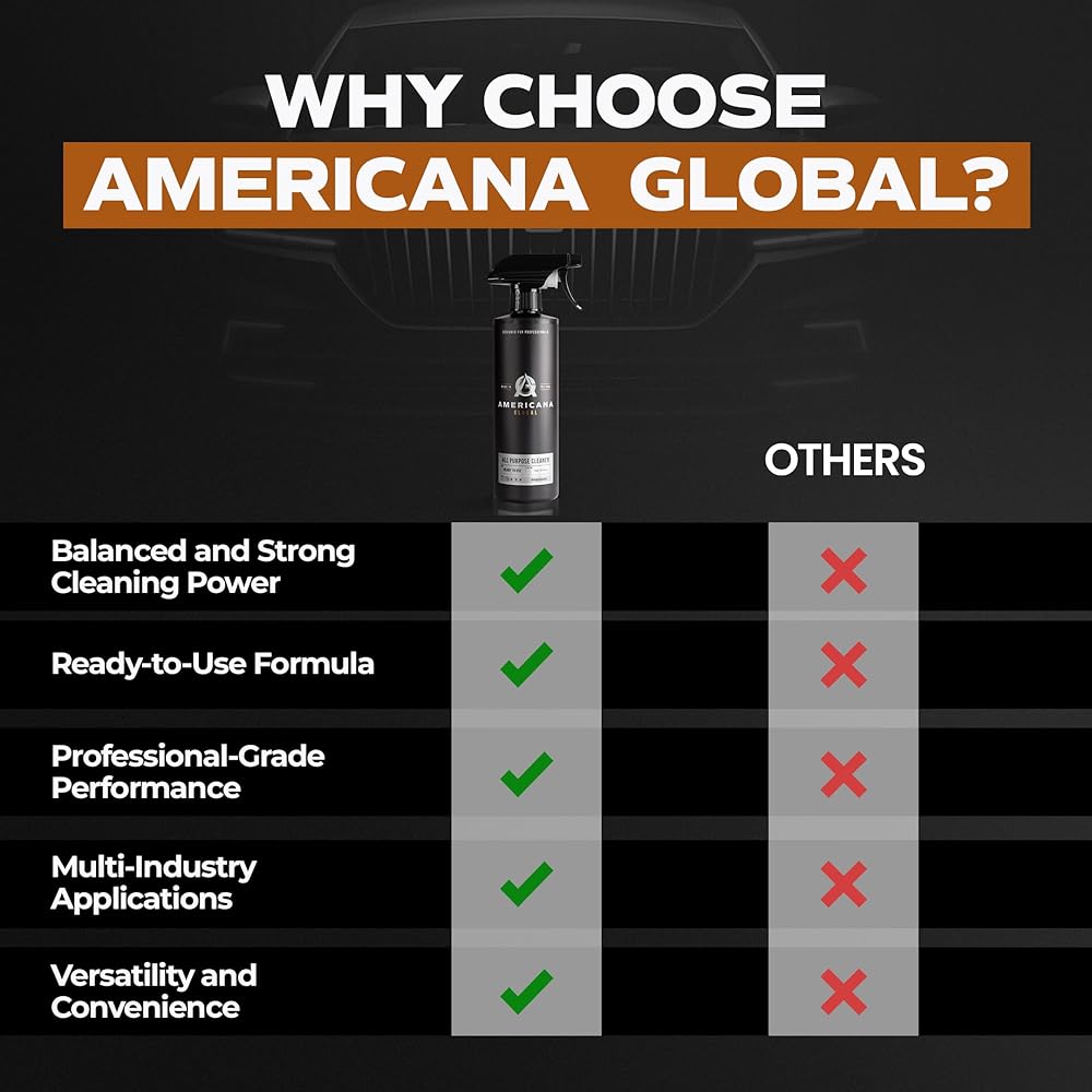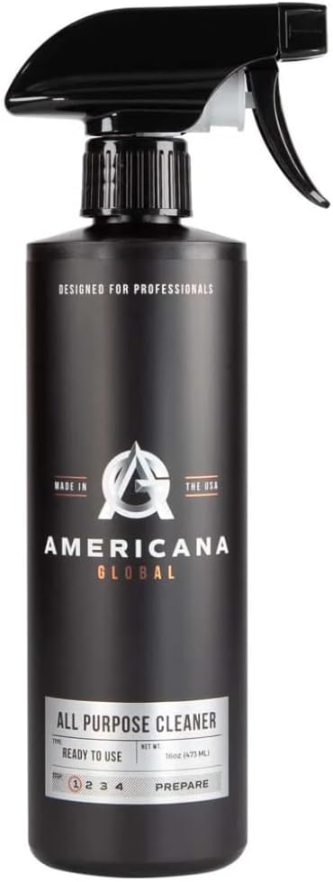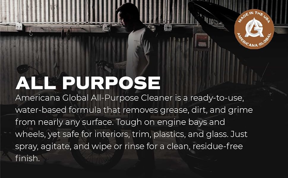 Professional Grade Cleaning: Americana Global All-Purpose Cleaner is a professional-grade, ready-to-use spray engineered for both interior and exterior automotive detailing. This degreaser removes stubborn grease, grime, oil, and dirt from surfaces including engine bays, undercarriages, and interior panels. A must-have for any car detailing kit.