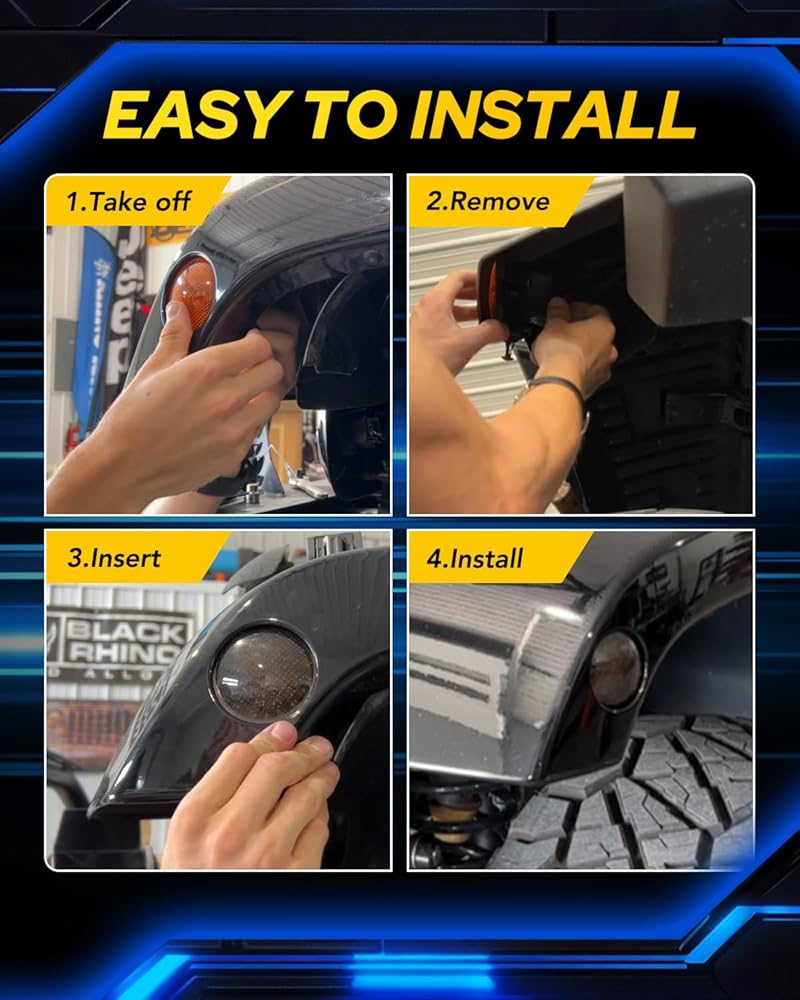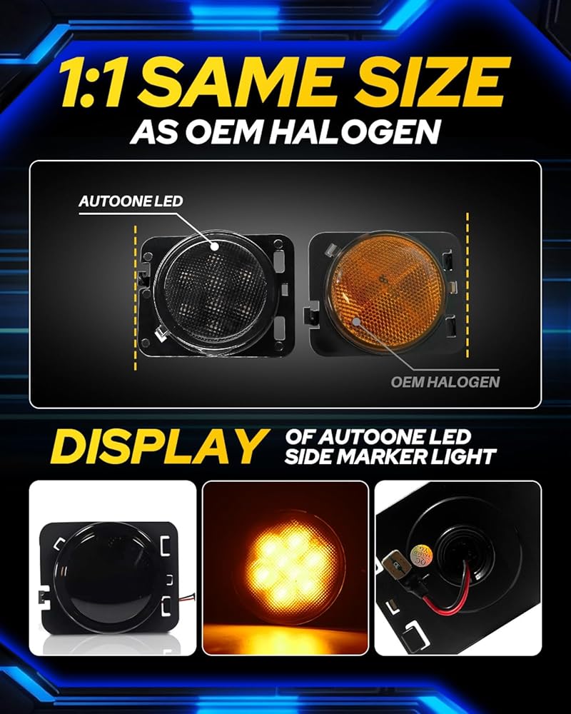 【Fitment】: AUTOONE LED turn signal side marker lights compatible with 2007-2018 Jeep Wrangler JK JKU, ensuring a perfect fit and seamless integration with your vehicle's body. Direct LED replacement for the side marker lights for Jeep Wrangler JK JKU. NOTE: not compatible with 2018 new body style (JL) models