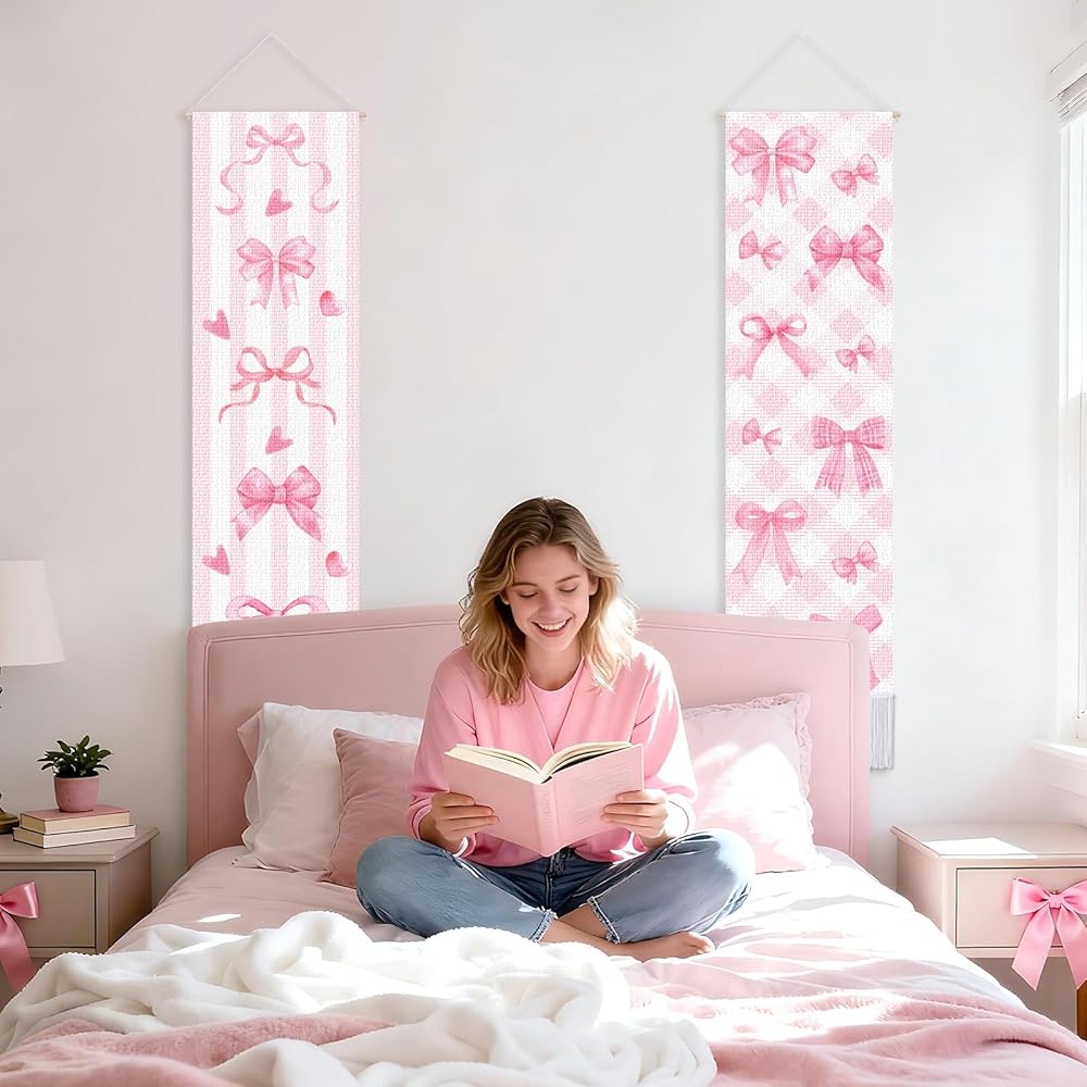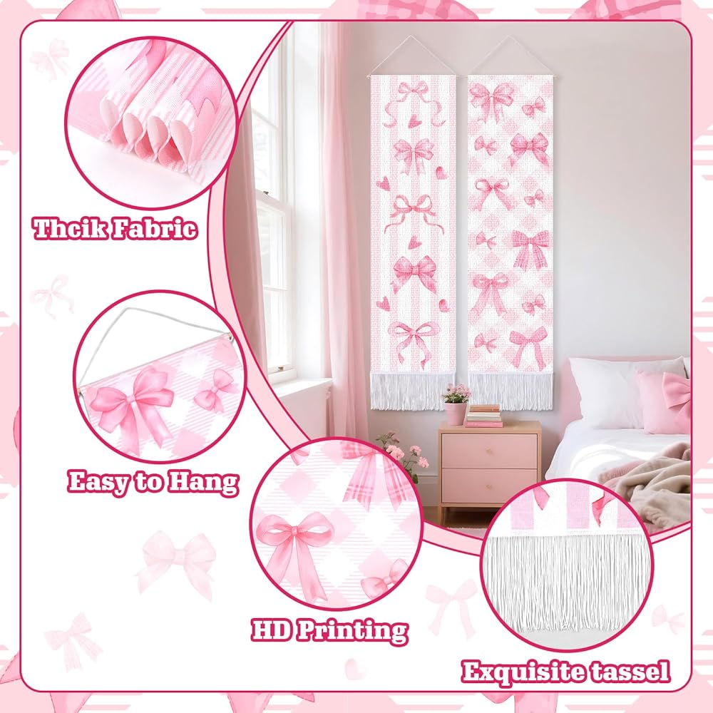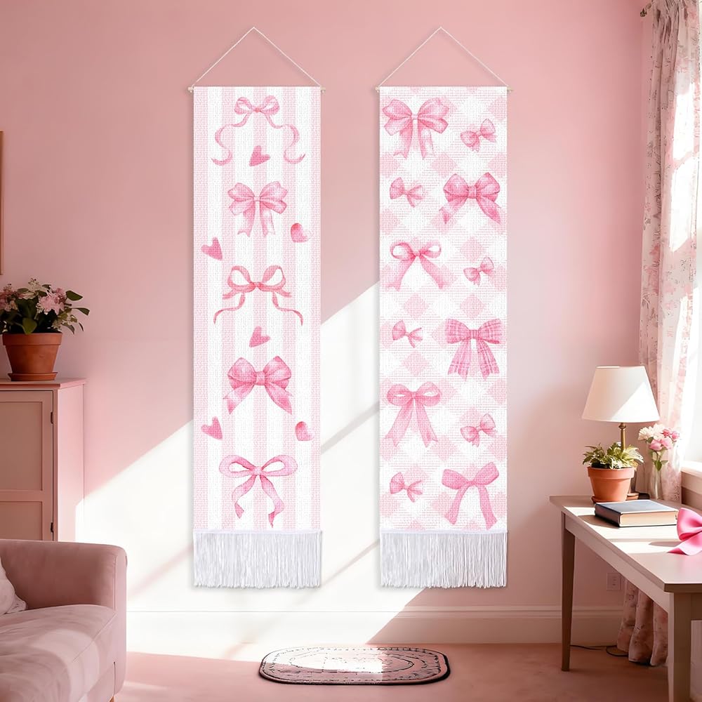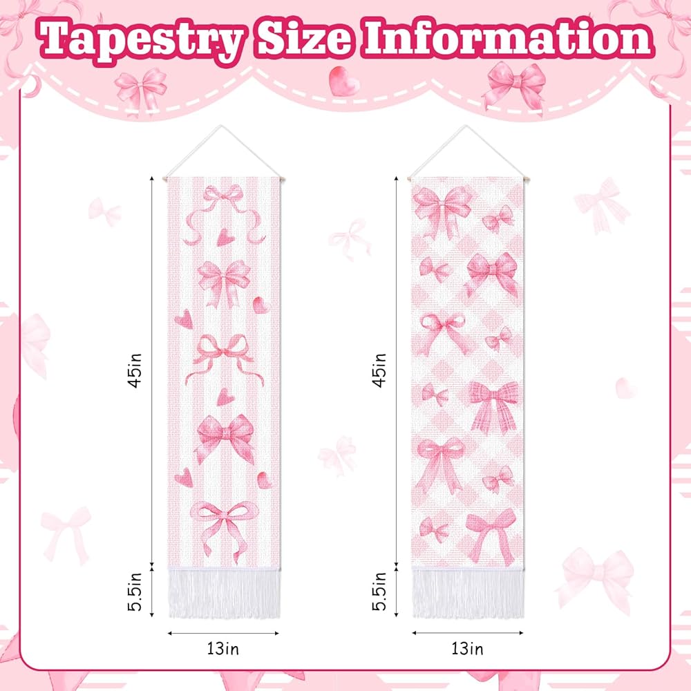 CORNER LANCE 2 Pack Pink Bow Vertical Tapestry, Wall Decorative Tapestries Hanging Art with Tassels for Bedroom Living Roomb Office, Home Decor Housewarming Gift (45.7x13 Inch)