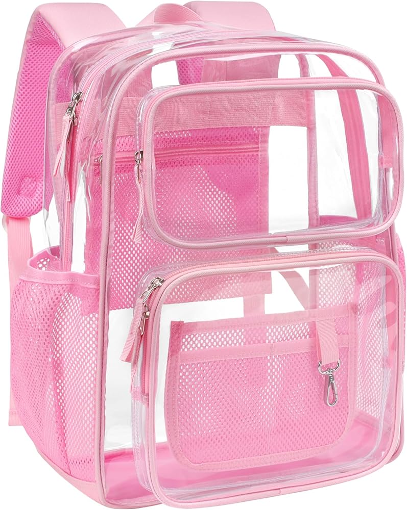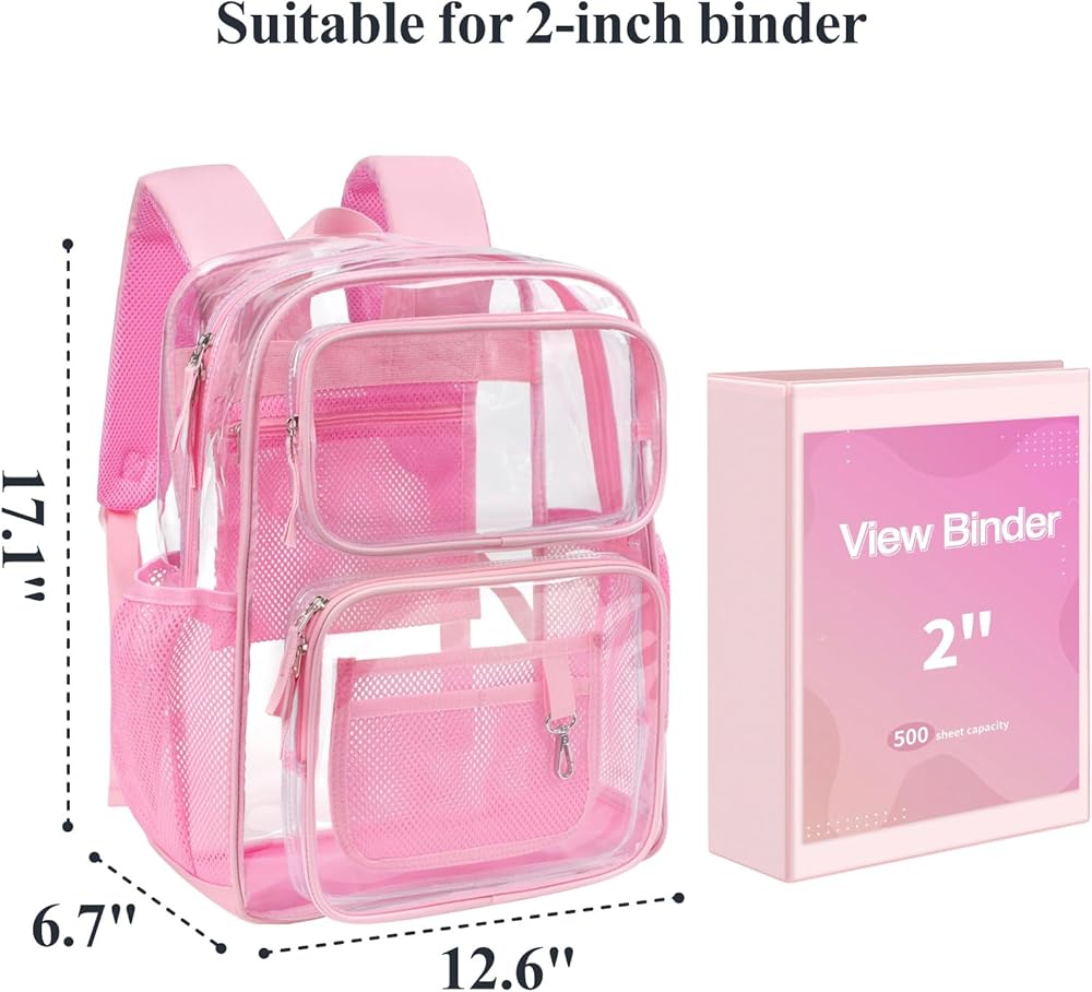PACKISM Clear Backpack for girls - 17 inch Large Heavy Duty Bookbag for School, Reinforced See Through PVC Transparent Backpack for Students, Cute Pink (Age 12+)