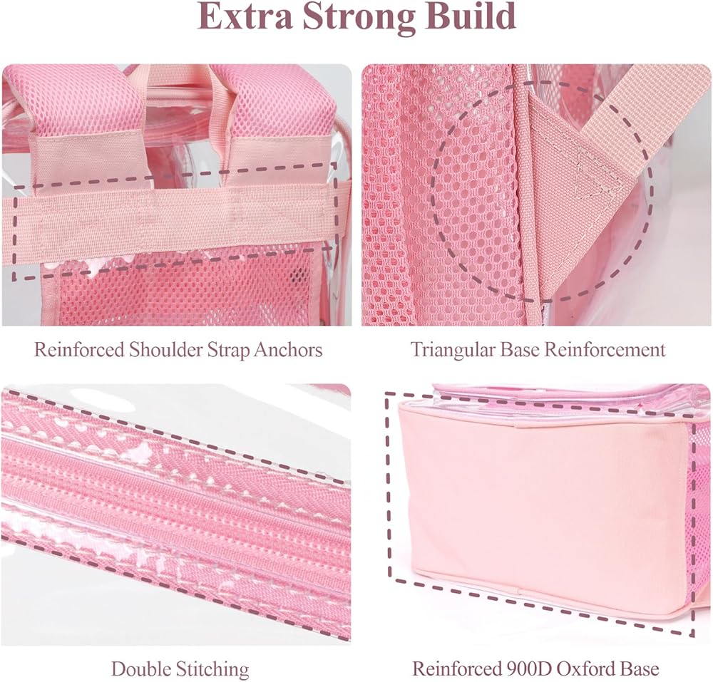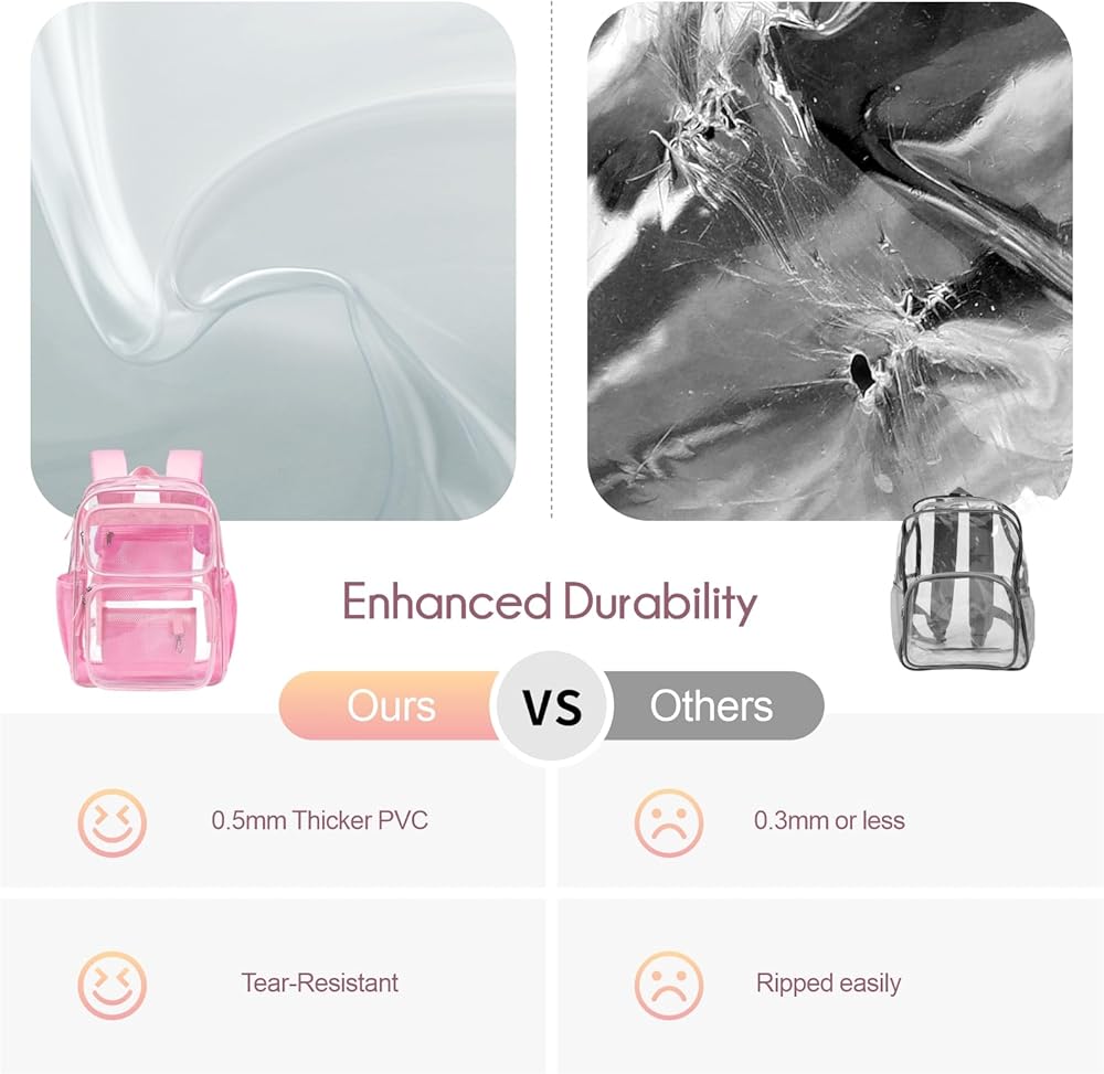Heavy Duty Durability: Crafted from 0.5mm thick PVC with reinforced cross-stitching at strap connections, this sturdy clear backpack for school also features an abrasion-resistant reinforced 900D Oxford base for extra durability. It is tested to withstand daily wear and support heavy loads up to 22 lbs without tearing