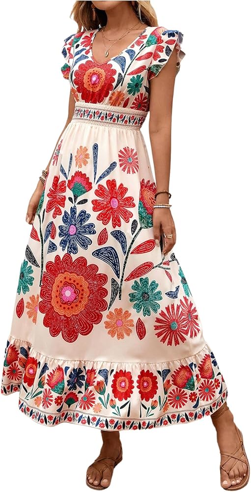 • Features: Tropical print, flower pattern, ruffle hem, flounce cap sleeve, v neck, shirred, high waist, a line, swing dress, sun dress, long flowy dresses for women