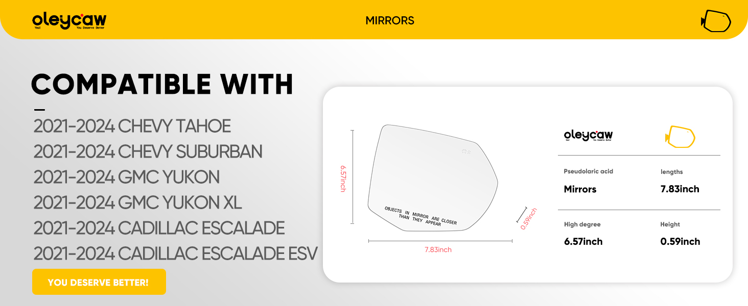 - OE design: Compatible with 2021-2024 Chevy Tahoe/Suburban passenger side mirror, 2021-2024 GMC Yukon/Yukon XL passenger side mirror, 2021-2024 Cadillac Escalade/Escalade ESV passenger side mirror. OE NO.: 84642722, GM1325217. No Auto Dimming