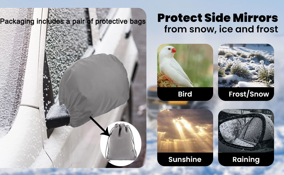 COMPATIBILITY: Replacement mirror cover cap compatible with KIA K5 Optima 2011 2012 2013 2014 2015. They are an exact fit, ensuring a seamless replacement that matches the original design of your vehicle. Our packaging includes car side mirror snow cover bag. Side mirror cover bag protecting your mirrors from snow, ice, frost, and rain.