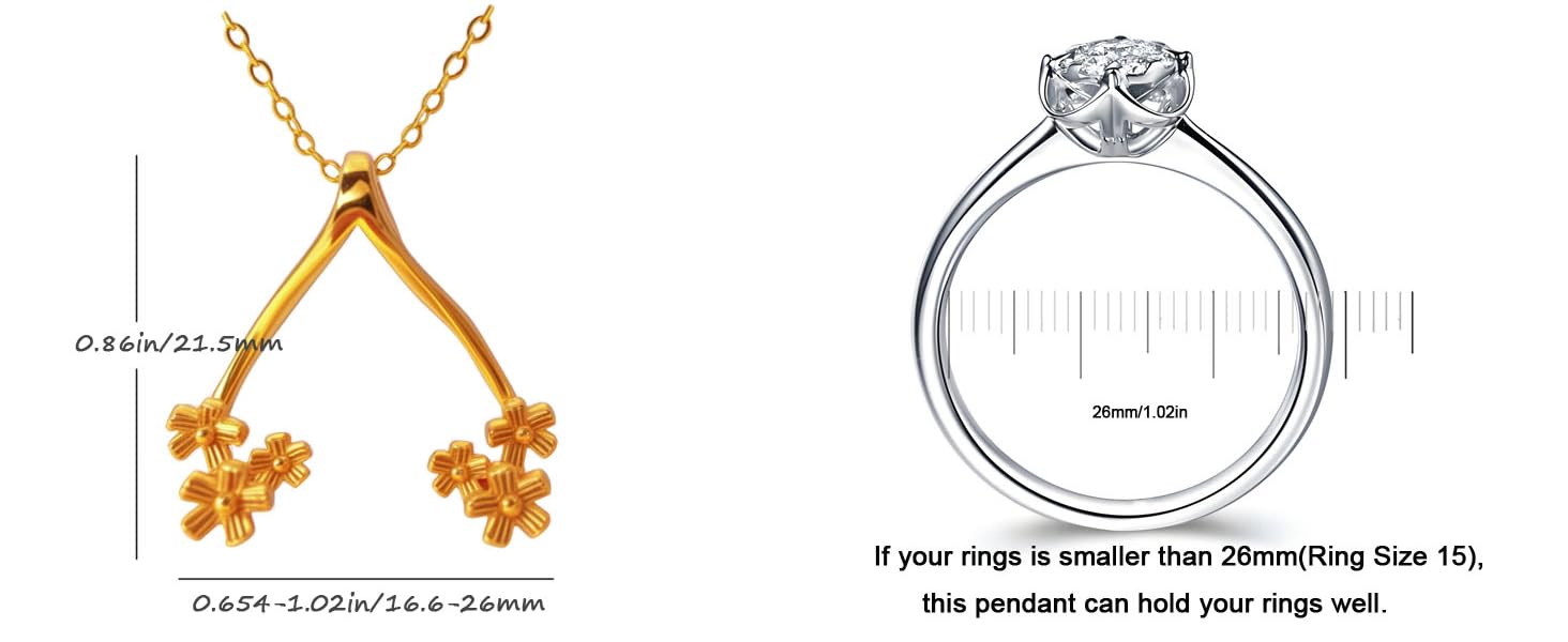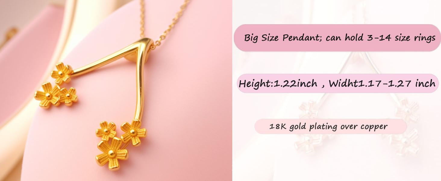 1. **Two Size** - The BIG SIZE can hold 3-14 Size Ring, the SMALL SIZE is more dainty can hold 3-5 size ring. And made of soft copper, the size of pendant also can be adjustable, Gently pry open the two brackets of the necklace with your hands and adjust the size of the necklace according to the size of the ring.