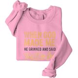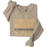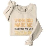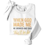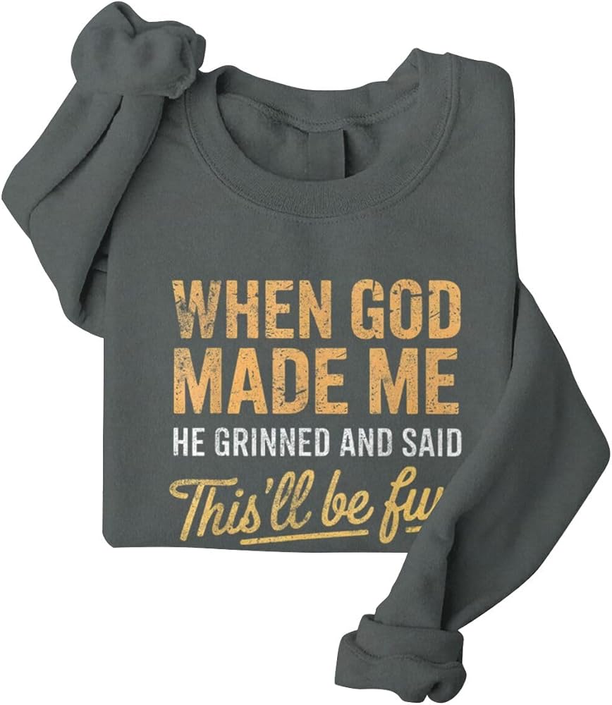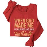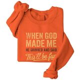 Feature: Christian Religious Jesus Aesthetic Sweatshirt, Bible Verse Shirt Oversized Sweatshirt, Christian Faith Pullover Tops, this graphic sweatshirts is printed with "When God Made Me He Said This'll Be Fun".