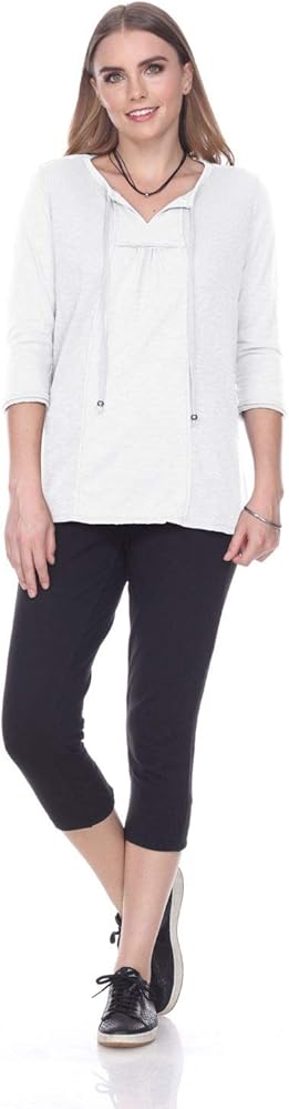 Flattering crew neck 3/4 sleeves top. Twill tape ties with silver ornament ends. Front and back panel made with rib raw edge seams and a high low hem.