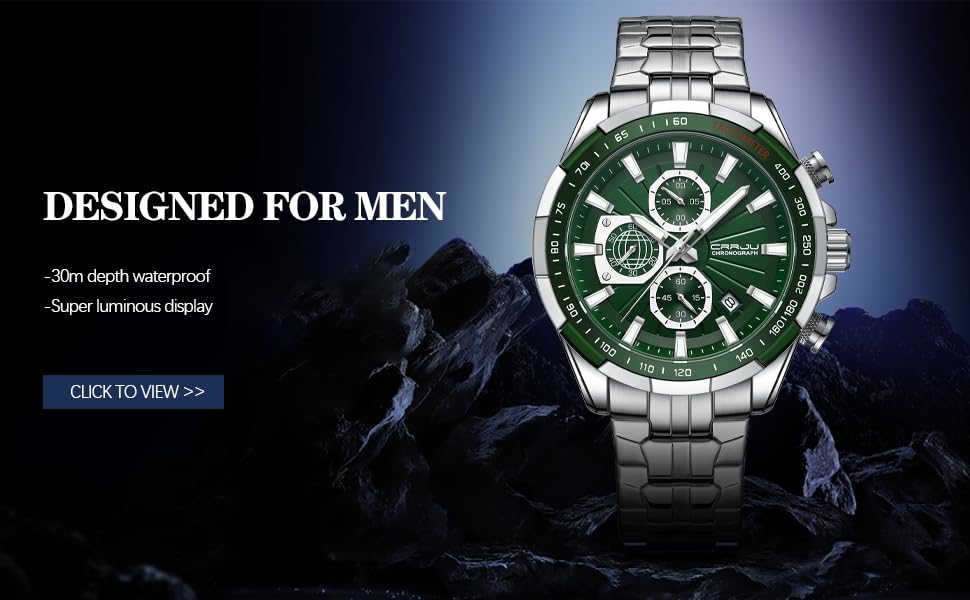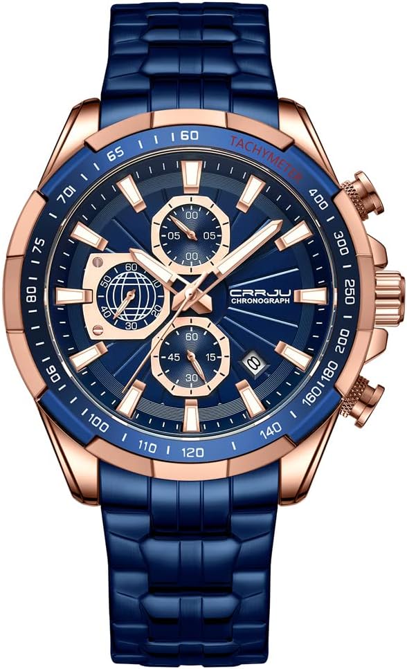 Product description: -CRRJU New Unique Design Style Men Classic Business Dress Wristwatch. - High Quality Japan Movement: provide precise and accurate time keeping - Textured Appearance, Exquisite Demonstrate Dignity. - 316L Stainless Steel shell and band, Sturdy clasp, durable for a Long Time. - 98FT/30M Normal Water Resistant: Hand washing, raining, daily use waterproof. Specification: Dial Diameter:47mm Band Width:22mm Dial Thickness:14mm Wear perimeter:240mm Weight:152g. Package Includes: 1 * CRRJU Men Watch 1 * Gift Box 1 * Watches tools 1 * Instructions and warranty card ADVICE FOR USE: 1.Please wear watch carefully in daily life. Don't collide your watch,Because it will create a shock to inside movement and electroplated layer of the watch may fade. 2. Use a soft and dry cloth to wipe off moisture, sweat and dirt has accumulated on the watch to maintain the durability of it. NOTS: 1.Do not wear the watch in hot water baths, saunas or environments with large temperature changes. 2.Do not put a water resistant watch in water while the crown is pulled out. If the watch touch water, dried in time. 3.Avoid placing it directly under running water from a faucet. The water pressure from a faucet is sufficient to result in moisture penetration inside the watch.