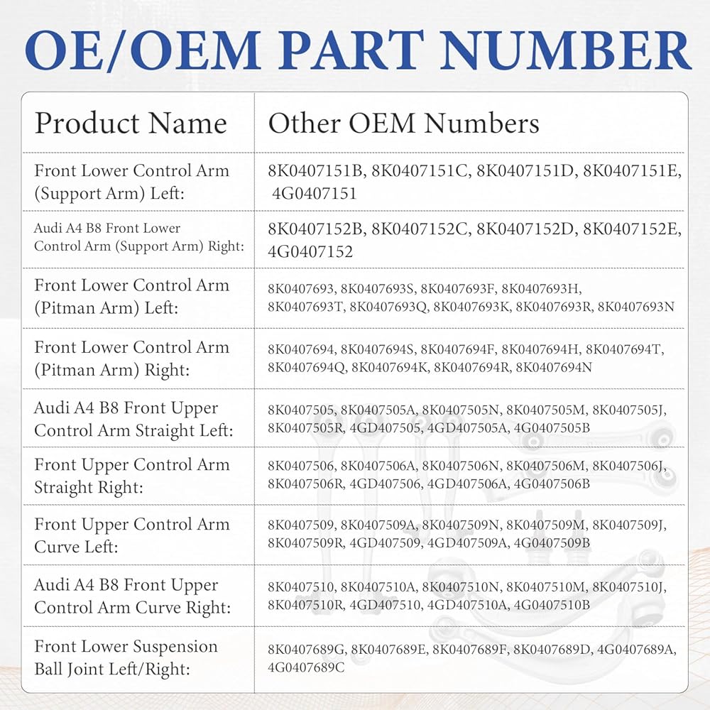 【OEM Part Numbers】8K0407505A,8K0407506A,8K0407609A,8K0407510A,8KD407151B,8KD407152B,4G0407693B,4G0407694B,4G0407689A*2