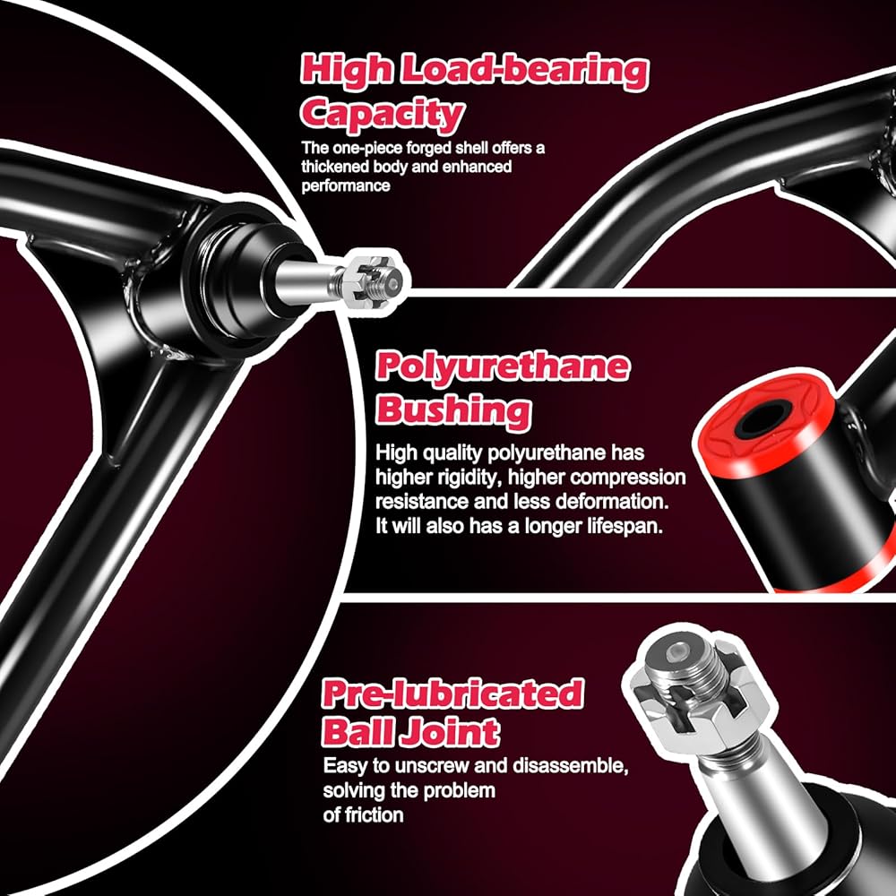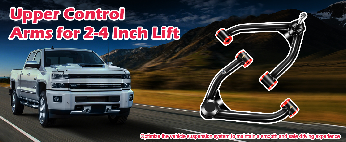 Upper Control Arms for 2-4 Inch Lift Solve The Following Problems:Unstable and poor steering, abnormal chassis noise, the tires are worn unevenly, poor braking performance. If your car have these problem, you need to replace a new item.