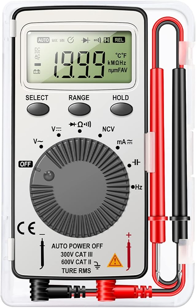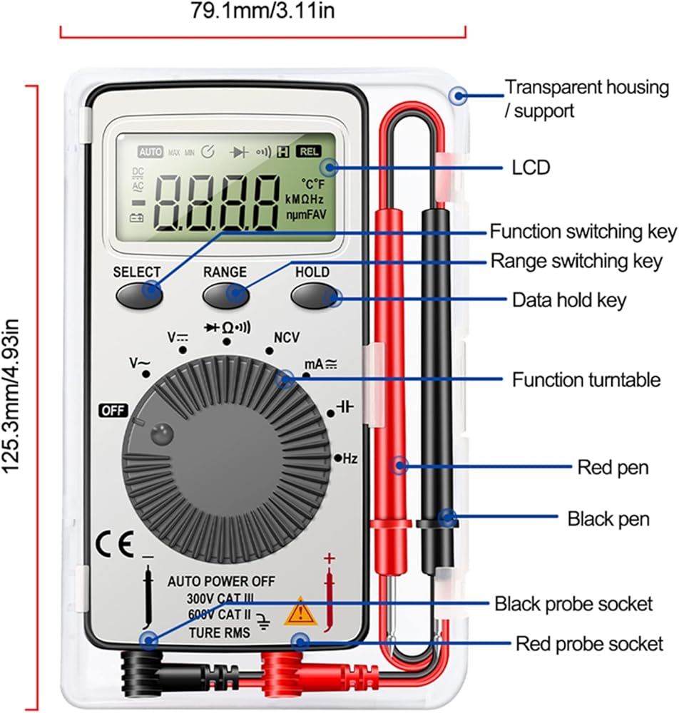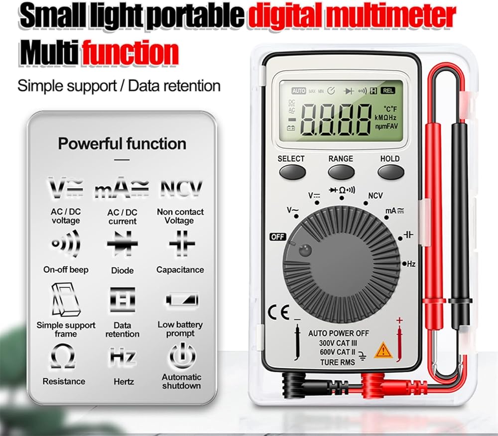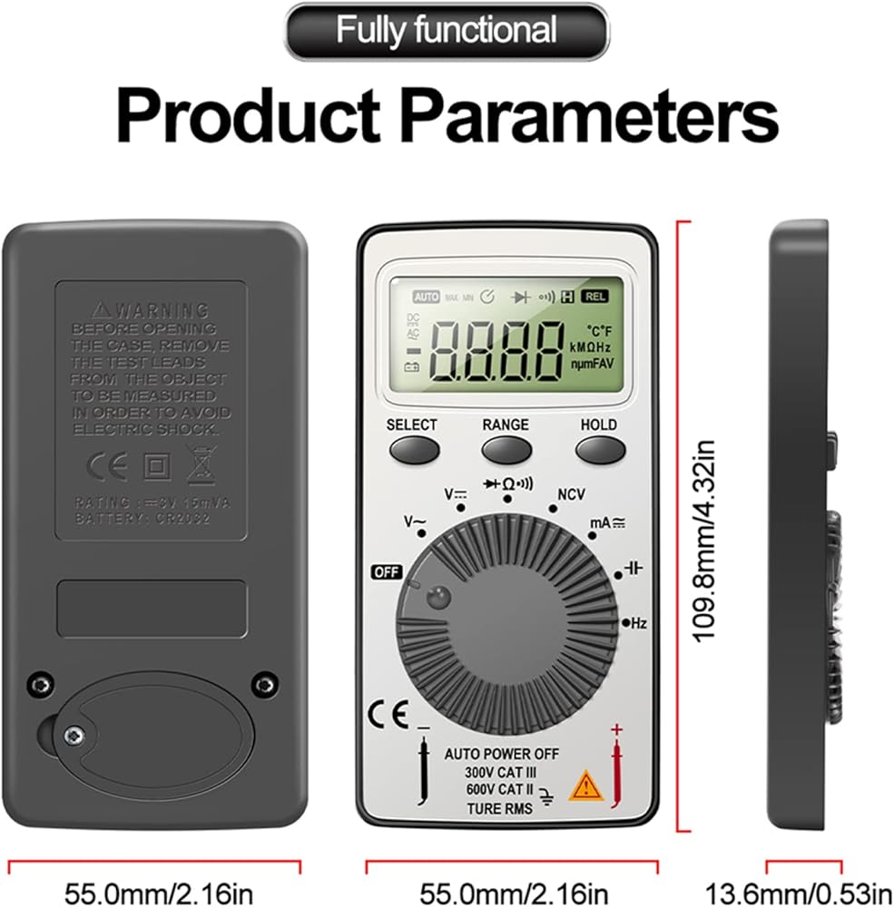 Digital Multimeter Auto-Ranging Voltmeter Tester Meter Voltage Meter Multifunctional Pocket Multi Tester with NCV- contact tester electricalFeatures:Alternating-current voltage- range: 4V-500V, Direct-current voltage- range: 400MV-500V, display: 1999.Auto-ranging for accurate measurement of voltage-, current, resistance-, continuity-, frequency, capacitance and diodes-.Non-contact voltage- testing and Live function with sound and light alarm-.It has stable performance, reliability, clear reading and overload- for protection.Designed to safely and accurately troubleshoot a variety of automotive- and household electrical problems.Specifications:Material: ABS Size: approx 110mmx55mm/4.3x2.2-inchSize: approx 10.9x5.5x1.36cm/4.3x2.2x0.5-inchDirect-current voltage- range: 400MV-500VAlternating-current voltage- range: 4V-500V display: 1999Package Includes:1x Digital MultimeterNote:Please allow 1-3cm error due to manual measurement. please make sure you do not mind before you bid.Due to the difference between different monitors, the picture may not reflect the actual color of the item.