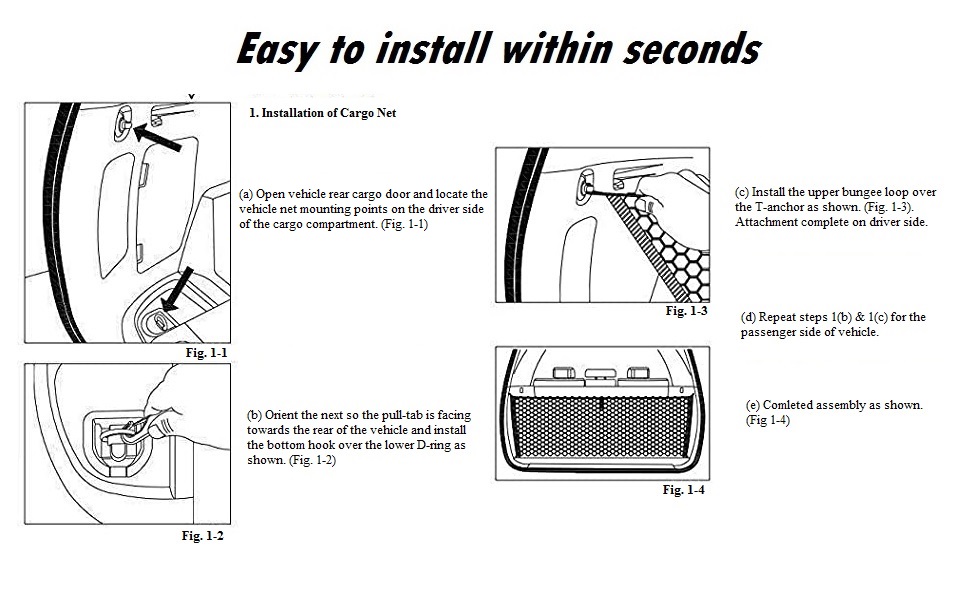 Easy to Install: The car storage rear trunk organizer is designed for individual car models. The net is very easy and quick to install, as well as secure and durable. Because it is designed for individual car models, no additional devices or new holes are needed for installation.