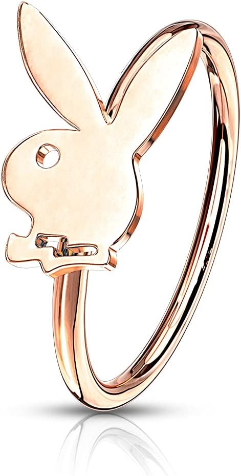 20G Rose Gold IP Plated 316L Surgical Steel 5/16 Inch Bendable Nose Hoop Ring with Playboy Bunny Top Nose Ring Piercing Jewelry - Sold Individually