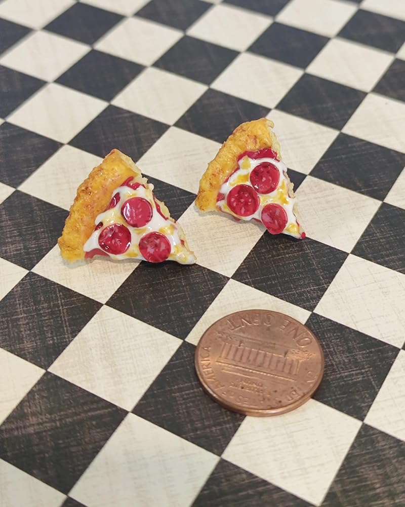 Novelty Jewelry: Miniature food stud earrings in the shape of realistic-looking pizza slices.