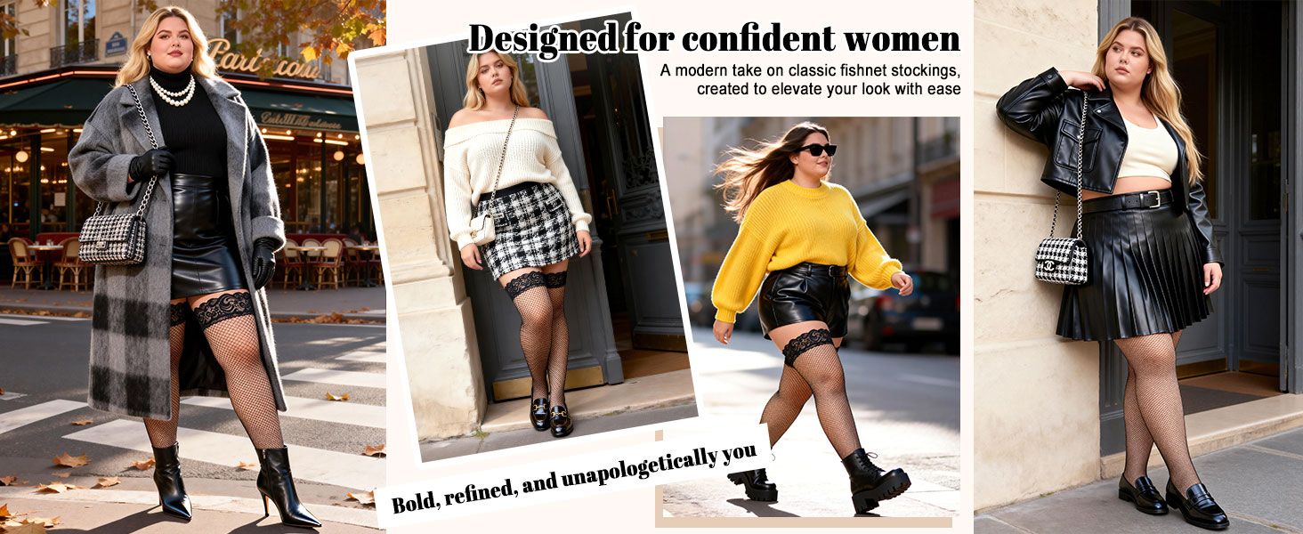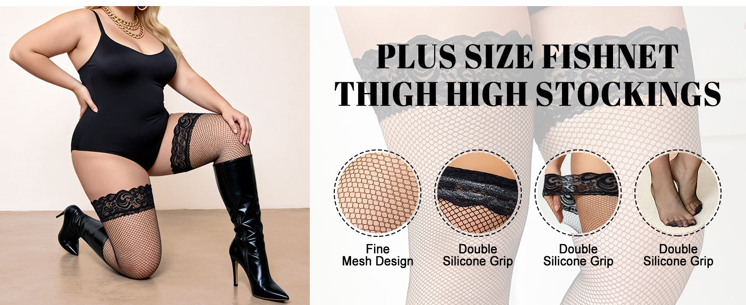 【Sexy Plus Size Thigh High Stockings for Party and Clubwear】Sexy plus size thigh high stockings designed for mature and confident curvy women. These fishnet thigh highs deliver bold fashion legwear appeal for date nights, clubwear, seasonal events, and costume styling while offering reliable stay up support.