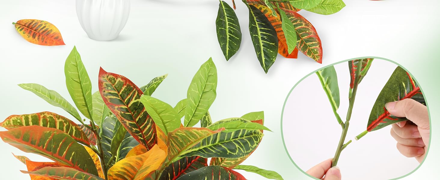 Lifelike Plant Decoration: Realistic appearance makes the fake Croton bouquet stem model more vivid. If you don't look carefully, you can't distinguish between real and fake. Artificial leaves are soft and comfortable to touch, their durability ensures that they won't fade over time, faux autumn plant display used for indoor home ornament do not require watering and maintenance.