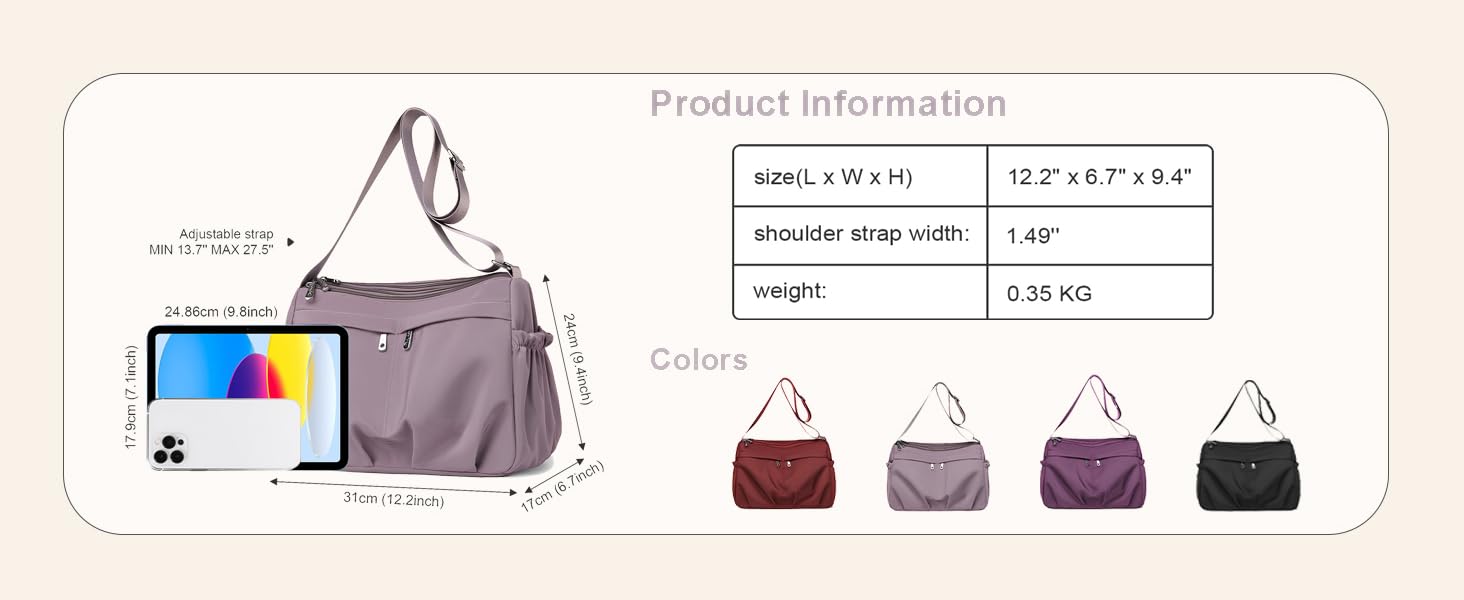 Crafted from durable nylon, this shoulder bag for women is not only stylish but also water-resistant, so a sudden rain shower won't ruin your day. Measuring 12.2"L x 9.45"W x 6.69"H (31x24x17cm), it's the perfect medium purse—compact enough to carry effortlessly but spacious enough to hold your essentials. Its multi-pocket design keeps your phone, keys, and wallet within easy reach, while the lightweight build ensures you stay comfortable all day long.