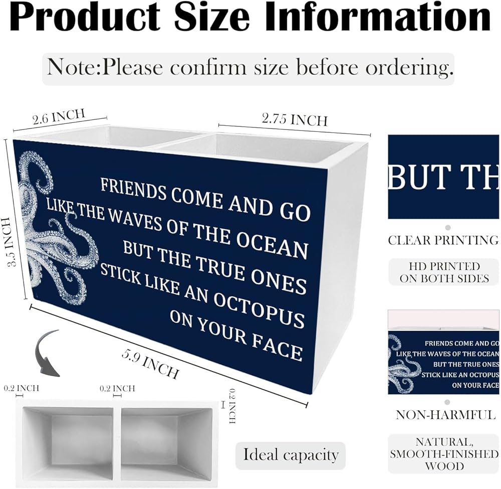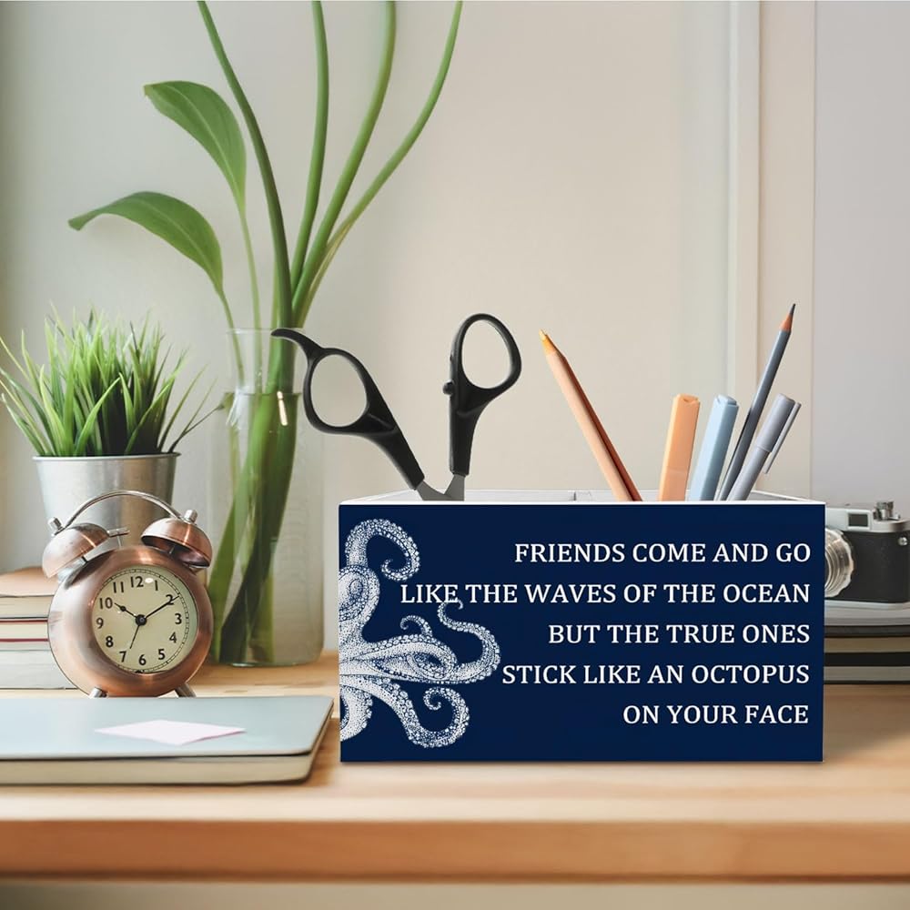 Funny Friend Gifts Pen Holder for Desk, Navy Blue Octopus Friends Come and Go Wooden Box Sign Desk Decor for Home Office Decoration, Friendship Gifts Pencil Organizer