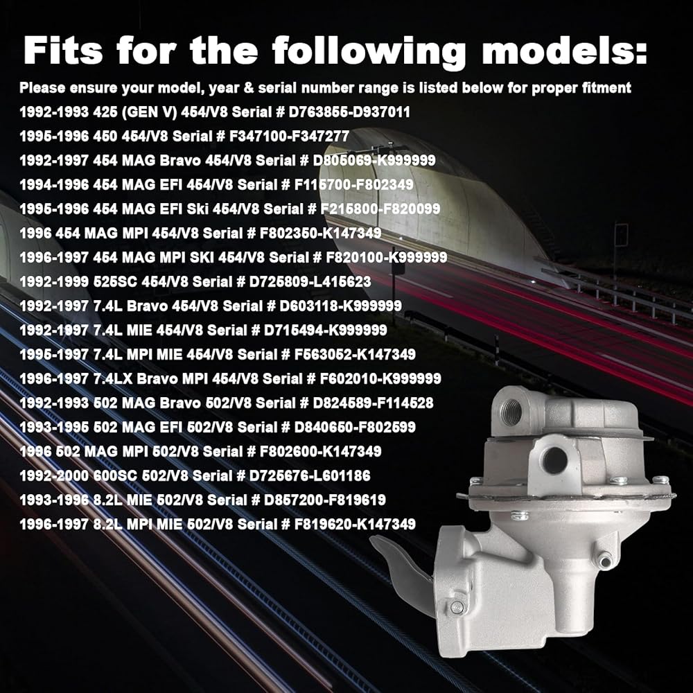 • 【Fitment】:Our Mechanical Fuel Pump is compatible with multiple vehicle models, including the Mechanical Mercury MerCuriSer V8 454, 7.4, 502, and 8.2 Big Block engines. Note: Before purchasing, verify the original equipment part numbers for the fuel pump: 861677T, 818383T, 18-8860. Ensure this is the required component.