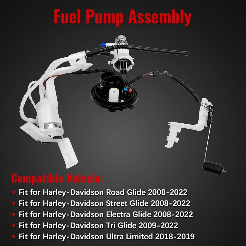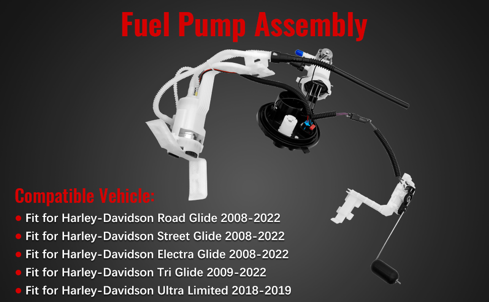 【Compatible Vehicle】The fuel pump with sending unit is fit for Harley-Davidson Road Glide 2008-2022, for Harley-Davidson Street Glide 2008-2022, for Harley-Davidson Electra Glide 2008-2022, for Harley-Davidson Tri Glide 2009-2022, for Harley-Davidson Ultra Limited 2018-2019