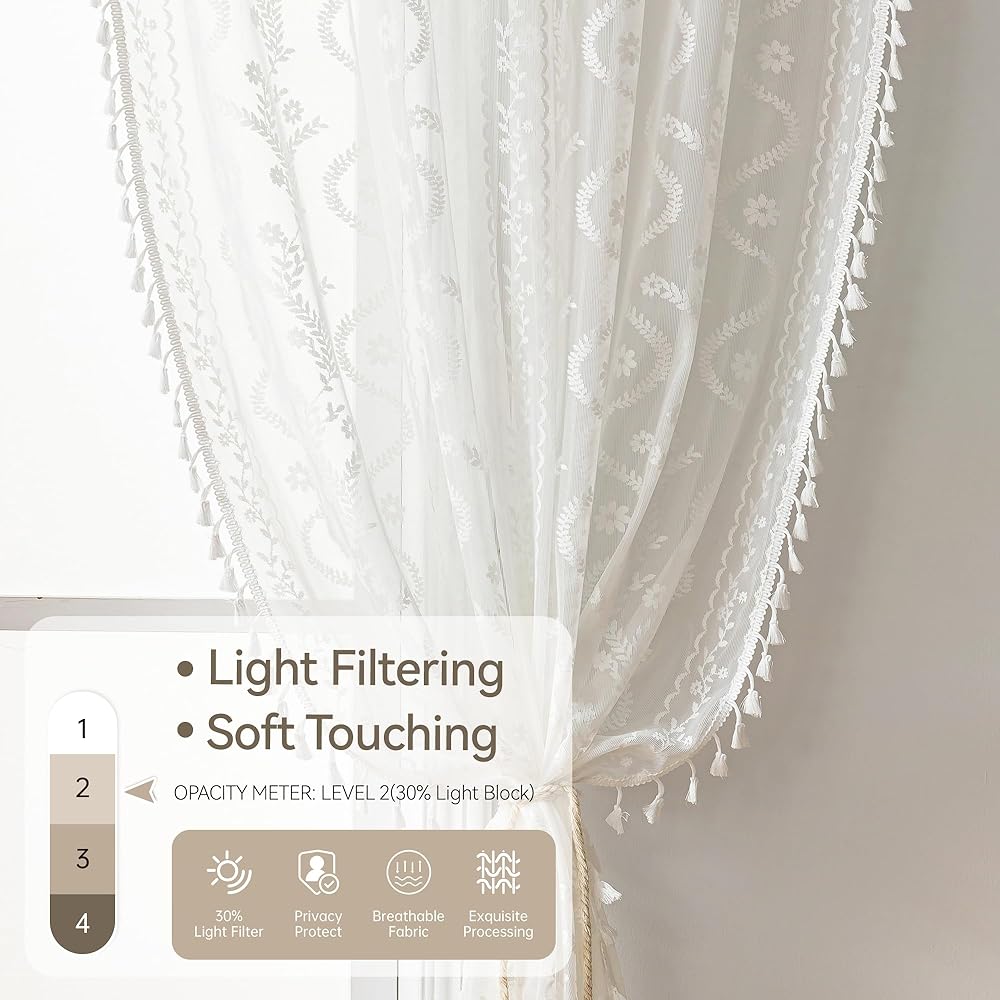 White Lace Curtains 63" - French Cottage Boho Sheer Panels with Floral Tassel Rod Pocket, Thin Light Filtering Drapes for Bedroom,Living Room,Privacy Transparent (Set of 2, 52" W x 63" L)