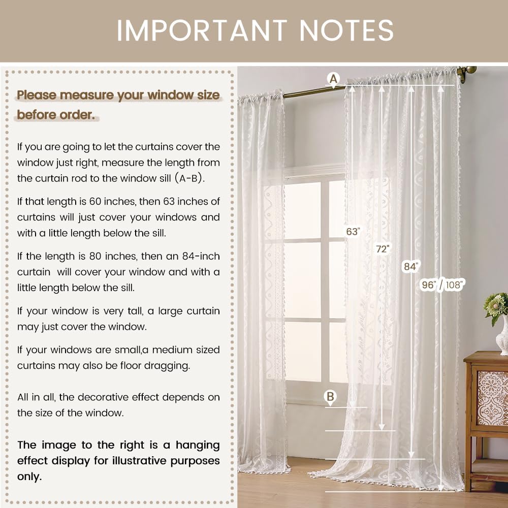 Package Includes:2 pack W52"xL63" lace sheer curtains (104" total width) with 3" rod pocket for easy installation,Compatible with standard rods ≤1.6" diameter,Ready to transform bedrooms/living rooms instantly