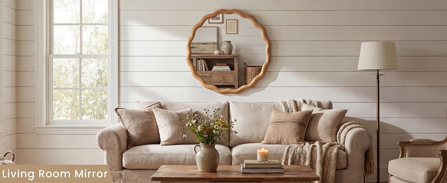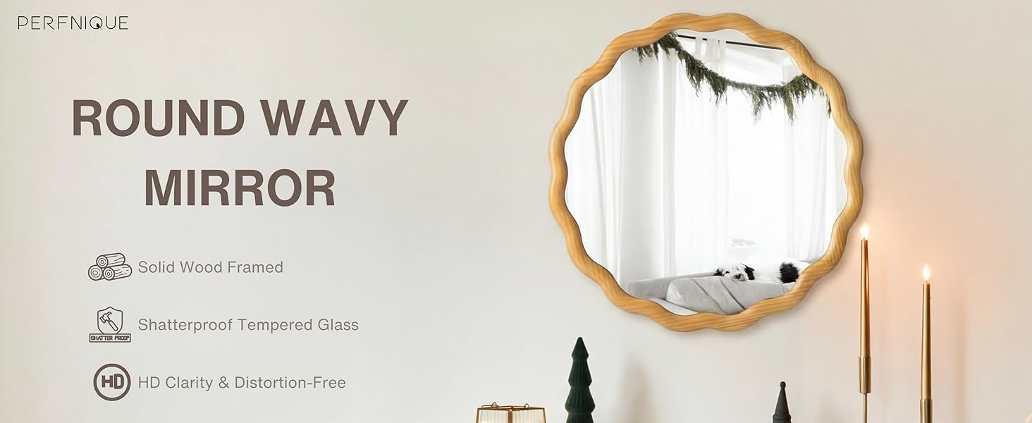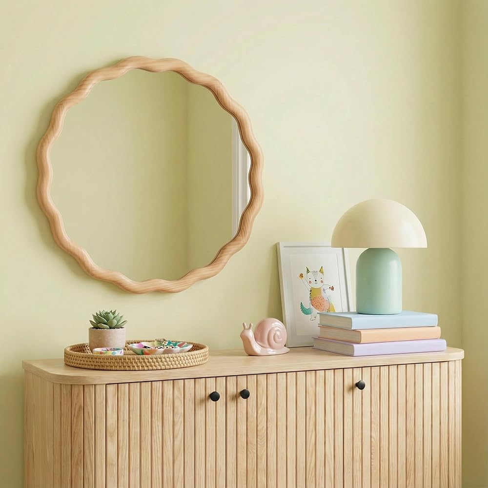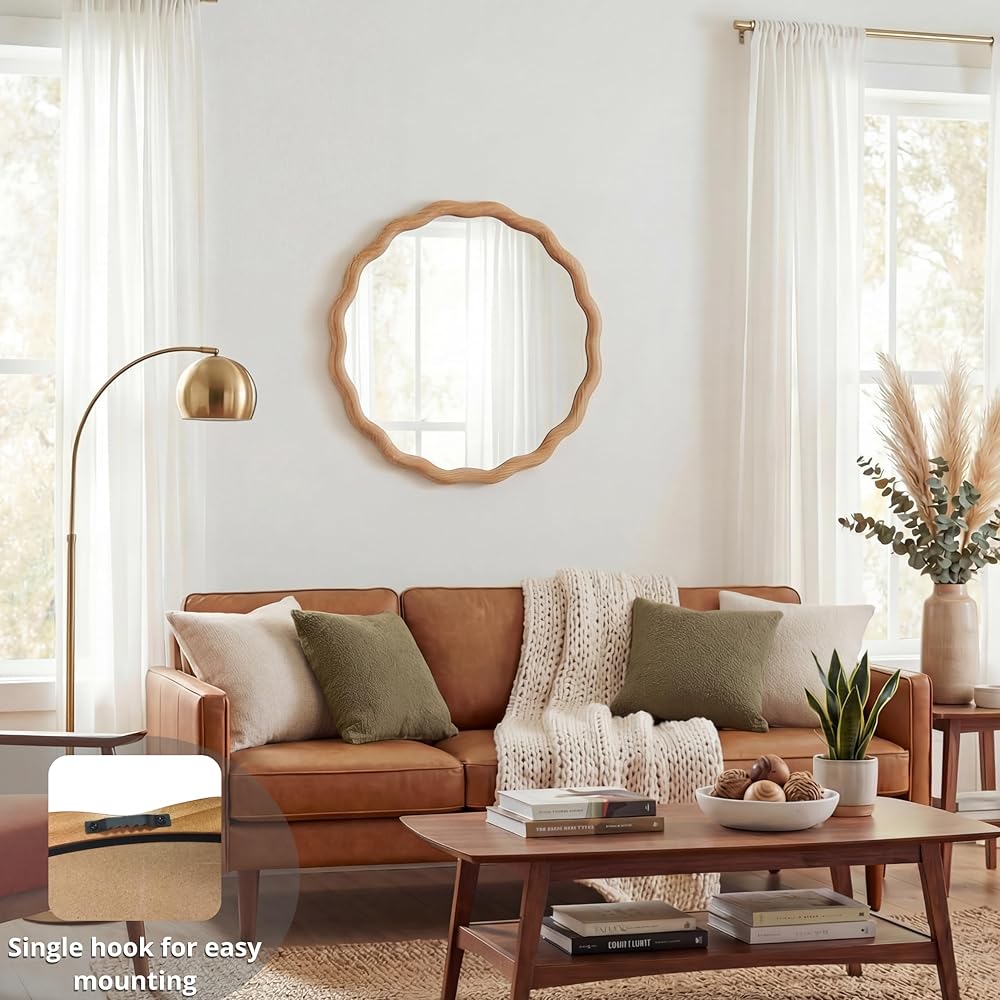 Wave-Edge Solid Wood Round Design: This round mirror features a refined scalloped edge that adds gentle movement to a clean circle mirror form. Framed in solid wood and sized at 24 inches, it offers a quiet statement ideal for curated round mirrors for wall decor.