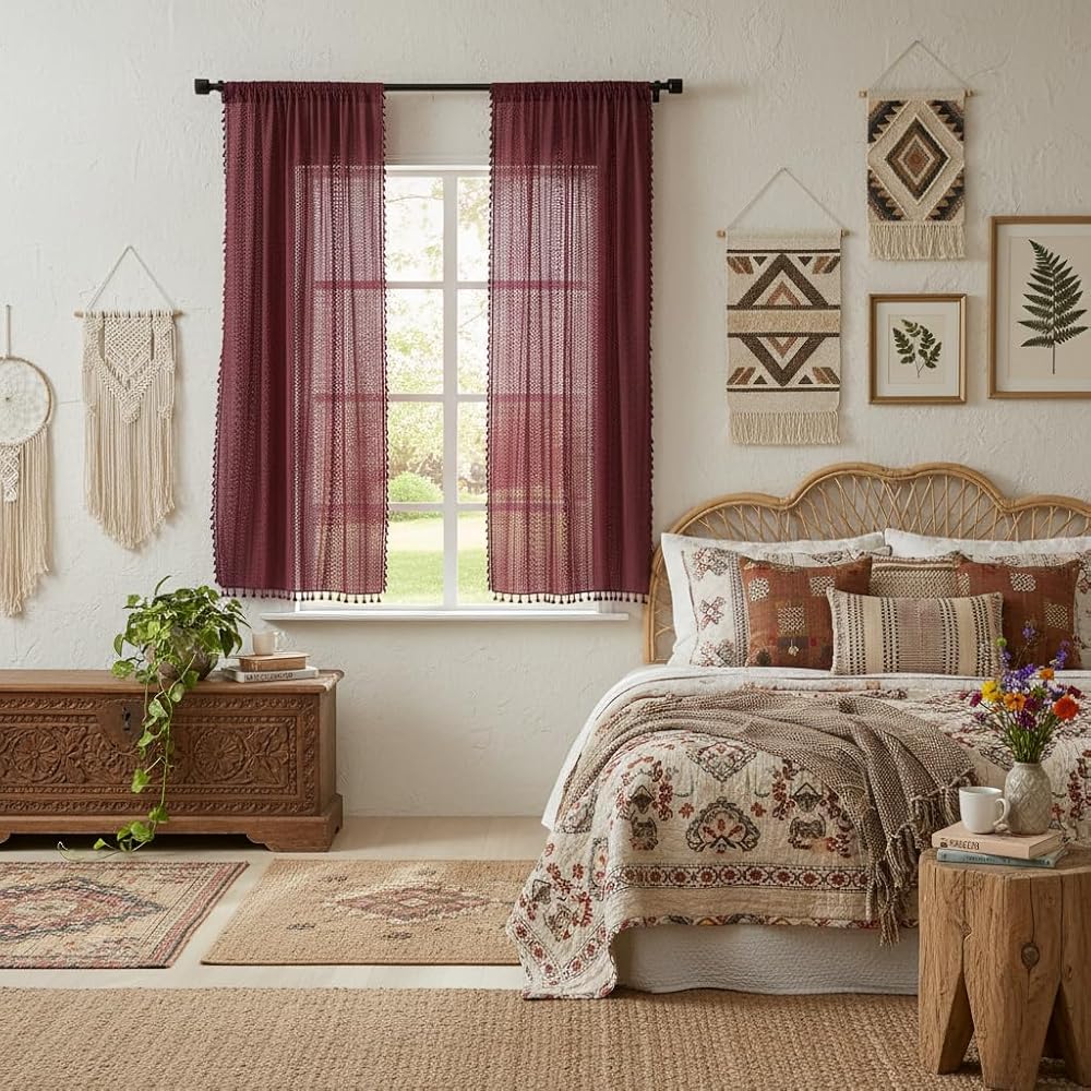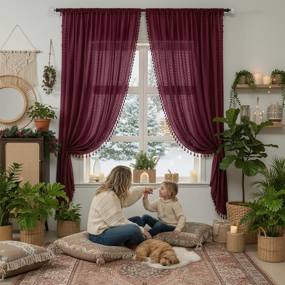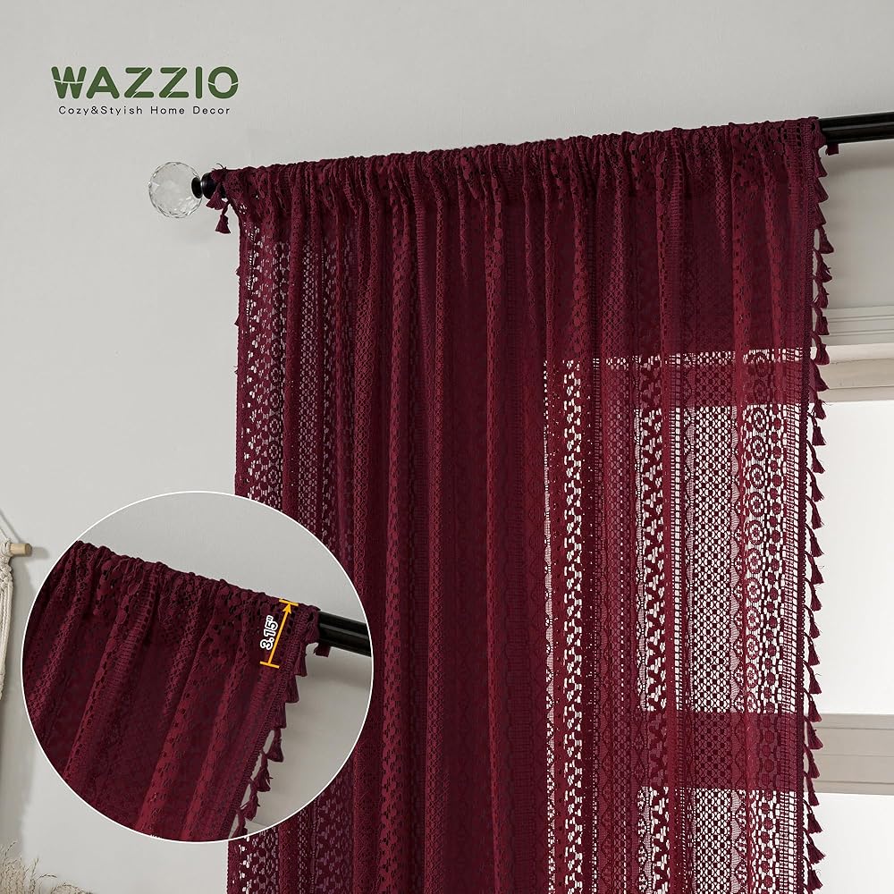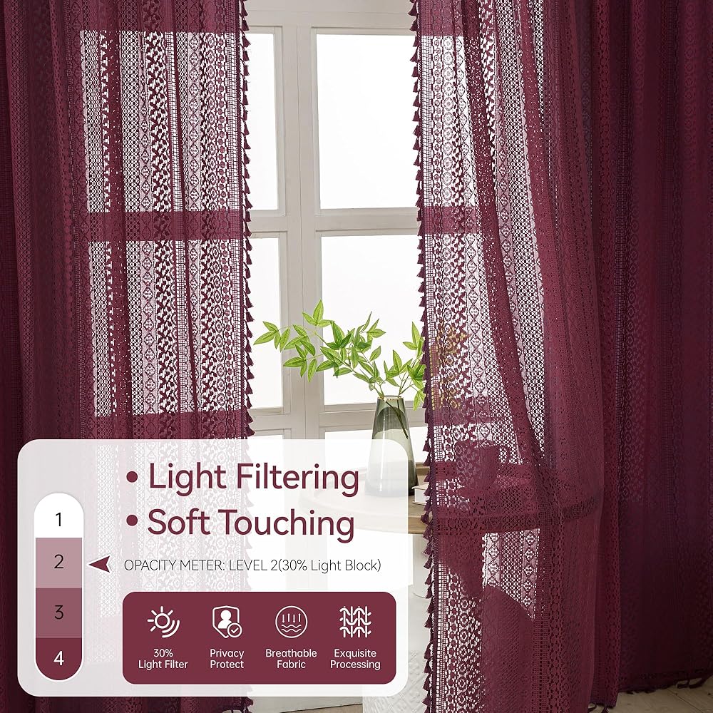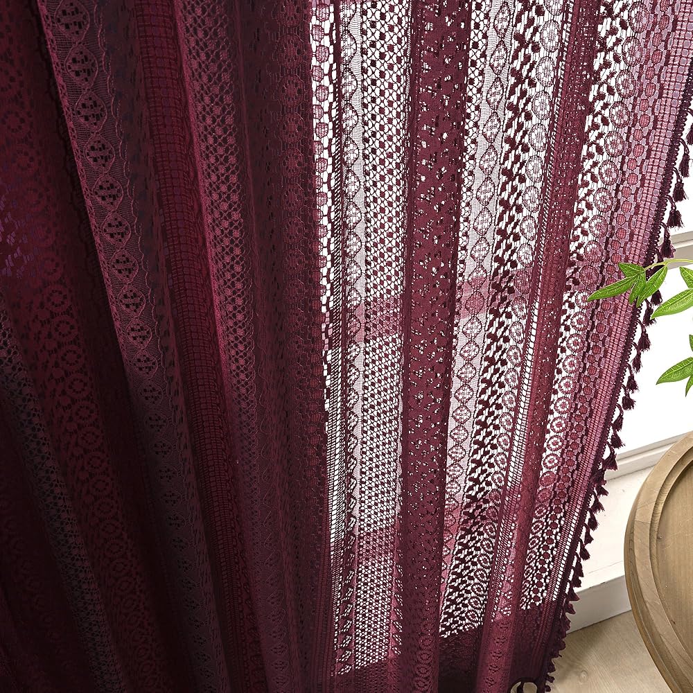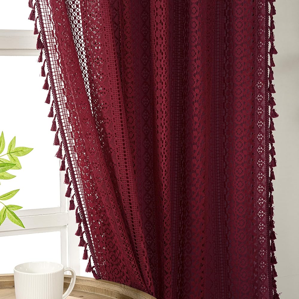 Boho Burgundy Curtains for Bedroom Living Room Window Drapes,Rod Pocket Cotton Blend Crochet Lace Privacy Light Filtering Wine Red Curtain Drapes Decor,Set of 2,59" W x 63" L