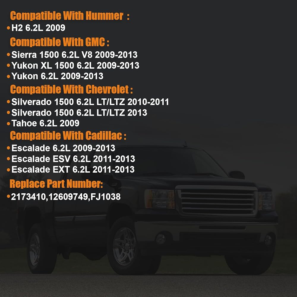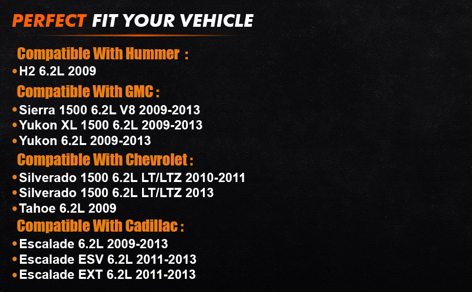 Compatible Models: This fuel injector are Compatible for Hummer H2 6.2L in 2009; fit for GMC Sierra 1500 6.2L V8 from 2009 to 2013; Yukon XL 1500 6.2L from 2009 to 2013; Yukon 6.2L from 2009 to 2013; fit for Chevrolet Silverado 1500 6.2L LT/LTZ from 2010 to 2011; Silverado 1500 6.2L LT/LTZ in 2013; Tahoe 6.2L in 2009; Escalade 6.2L from 2009 to 2013; Escalade ESV 6.2L from 2011 to 2013; Escalade EXT 6.2L from 2011 to 2013. Please confirm the compatibility with your vehicle before purchase.