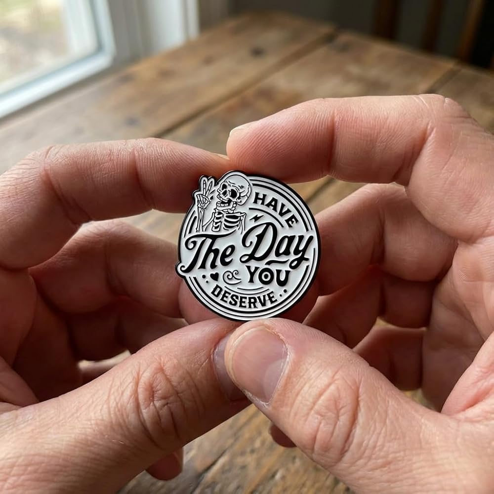 Cool Aesthetic, Witty Attitude:Elevate your style with this funny pin that blends retro cool with modern humor. Featuring a unique skeleton design and the ambiguous phrase "HAVE The Day & YOU DESERVE," this brooch is the ultimate statement piece. Its bold, black-and-white look makes it a versatile accessory for your backpacks, jackets, and hats, perfectly showcasing your cool and laid-back personality. A Gift That Speaks Volumes:Searching for a cool gift for a friend with a distinctive sense of humor? This pin is an unbeatable choice. It's a fantastic gift for any sarcasm lover or fan of vintage design. This unique present is more than just a brooch; it's an inside joke, a style statement, and a small badge of honor they will be proud to wear.