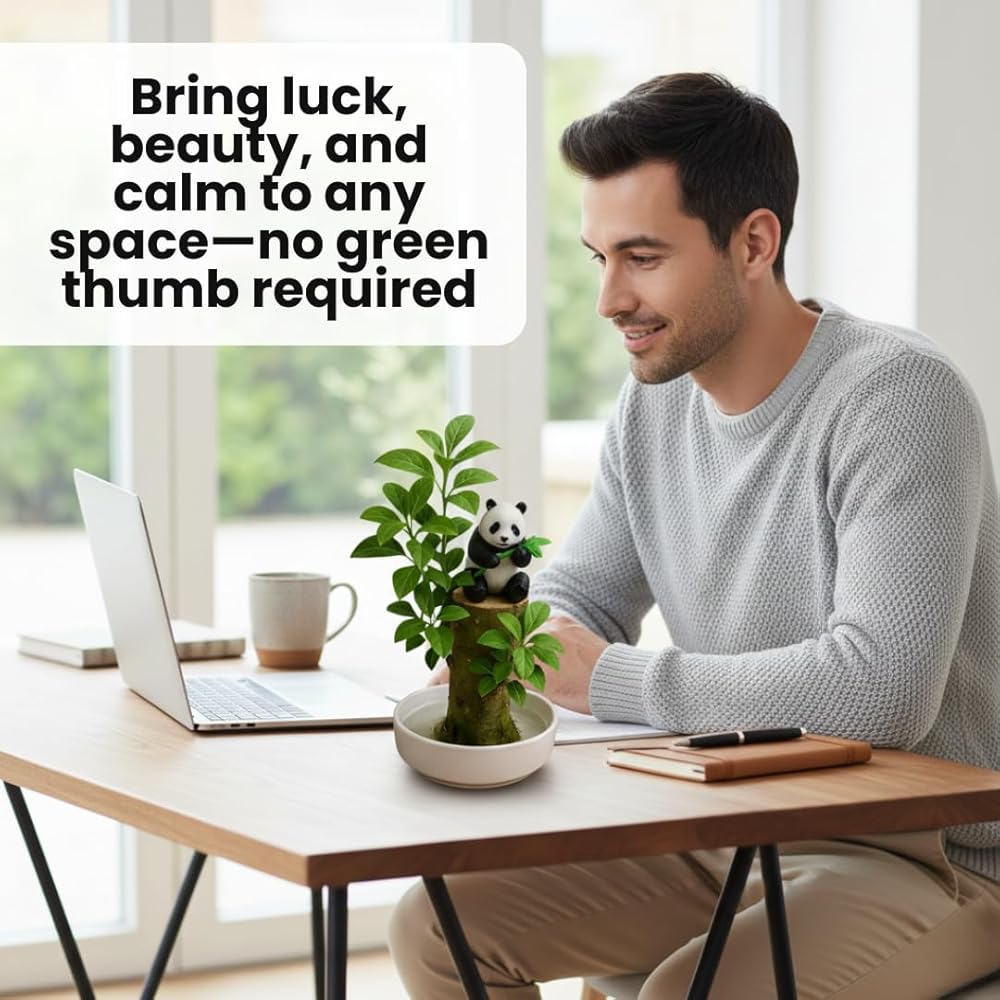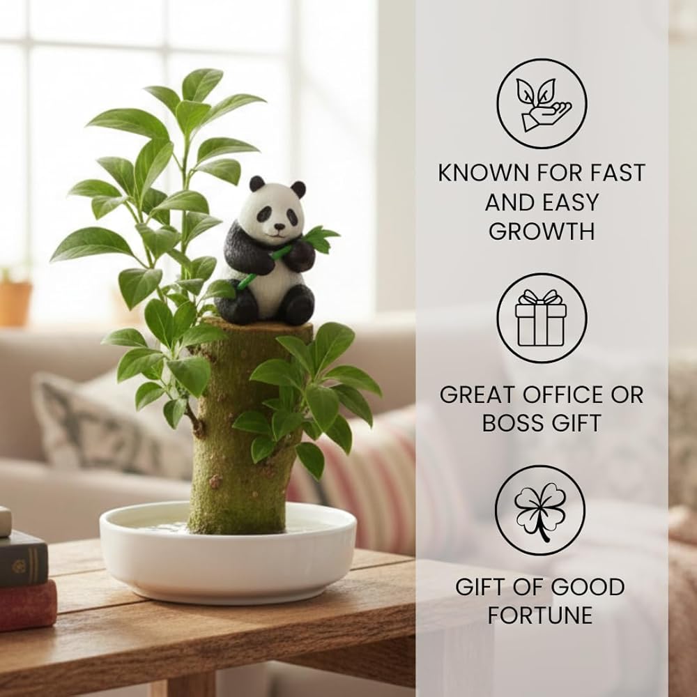 BEAUTIFUL DWARF TREES: Grow this amazing and lucky tree almost anywhere. Comes with the tray and the lucky panda figure. You get 3 whole sets. The 3 tree cuttings, 3 white water trays, and 3 Lucky Pands Figurines